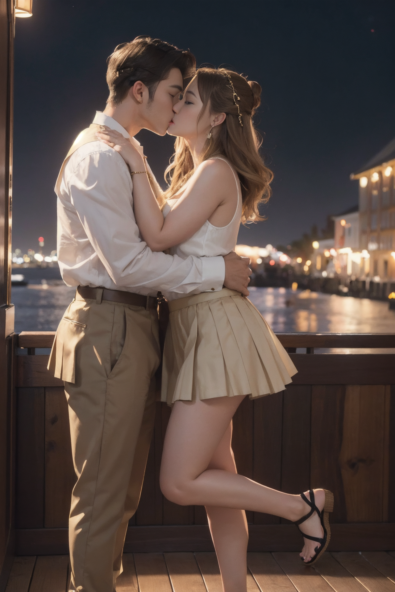 summer, (girl wearing a pleated skirt with a tank and sandals, Tall, Fit, Round Face, Olive Skin, Honey Blonde Hair, hazel Eyes, Narrow Nose, Thick Lips, Round Chin, Long Hair, Thick Hair, Bun, Faux gauge earrings, fuchsia metallic lipstick), (man wearing an expensive suit, short hair, handsome,) movie scene, dramatic lighting, cinematic render, high quality, ultra resolution, masterpiece, 8k, elaborate romance, 1boy, 1girl, (kissing:1.5), a man kissed a girl on the ship deck, at the midnight, full moon,