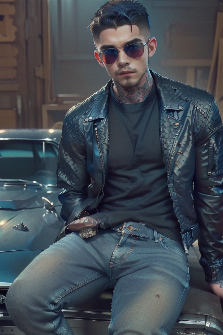 (1boy),(lean on 1970 Dodge Challenger),(cinematic lighting),(highly detailed),(CG),(blue jeans),(leather jacket),(black boots),(smoke effect),(reflective shades),(vintage watch),(scruffy facial hair),(tattoo on arm),(muscular build),(confident expression),(sharp jawline), <lora:asianman-000002:0.75>