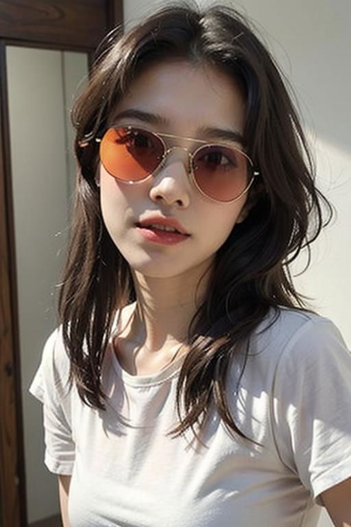 (aviators, lunettes de soleil teintées, reflet), Côté visage, solo, Haut du corps, t-shirt, rouge à lèvres rouge, chef-d'oeuvre, photoréaliste, profondeur de champ, 8k, UHD, anatomiquement correcte, peau texturée, détails élevés, meilleure qualité, dslr, lumière douce, grain de film, Fujifilm XT3, pose sexy en position debout