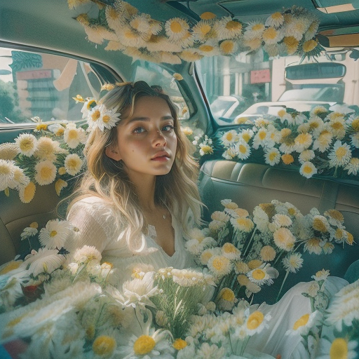 (masterpiece, top quality, best quality, official art, beautiful and aesthetic:1.3),extreme detailed,colorful,highest detailed,((ultra-detailed)), (highly detailed CG illustration), ((an extremely delicate and beautiful)),cinematic light,((A girl, a car, car interior, flowers, daisies))