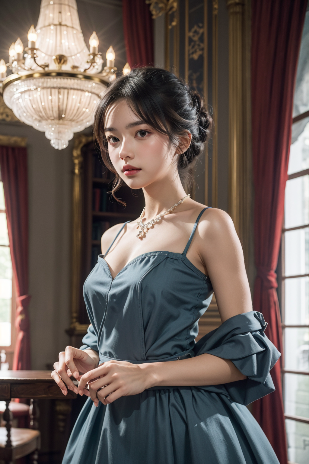 A girl in a modern, elegant ball gown, styled with a sleek updo and minimalist jewelry. She should have a confident, regal expression. The background is a luxurious modern palace, with clean lines, high ceilings, and extravagant chandeliers. The photo should be shot in high definition, with a sharp focus on the subject and a soft, blurred background for a captivating portrait. filmg, <lora:FilmG3:0.8>