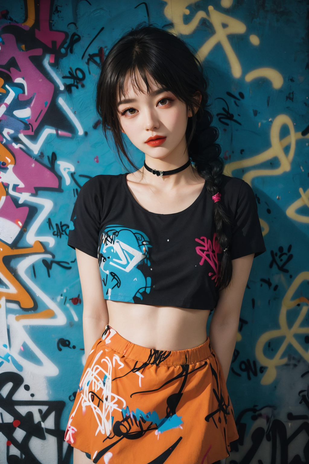 <lora:yan2:0.7>, masterpiece, best quality, 1girl, solo, stylish crop top, vibrant red hair, elegant braid, soft bangs, alluring choker, (graffiti:1.5), artistic paint splatter, seductive arms behind back, leaning against wall, looking at viewer, fashionable armband, urban hiphop style, flirty skirt, playful head tilt, intense expression, warm orange, dynamic asymmetrical design, bold geometric shapes, creative street art