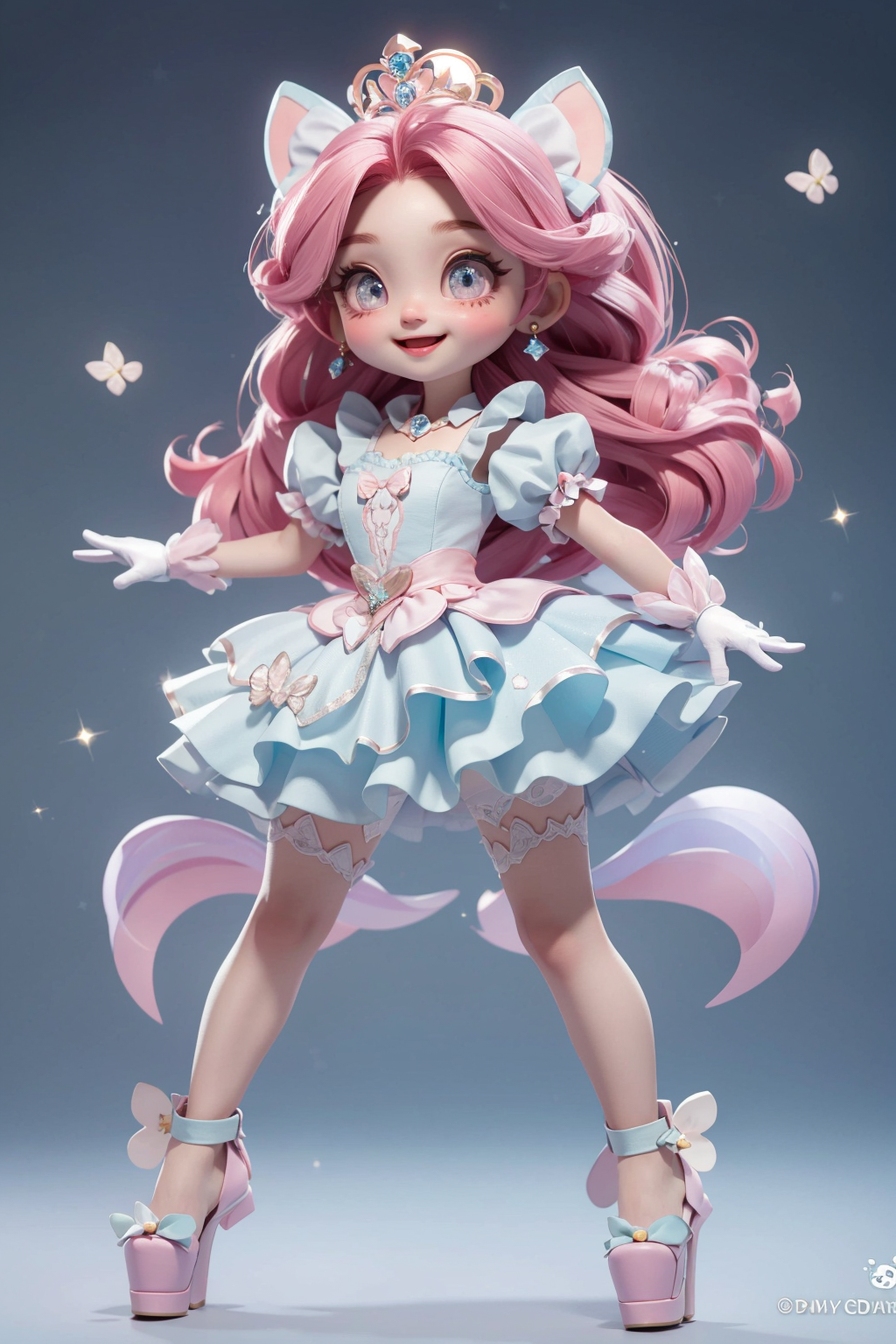 masterpiece, best quality, 8k, cinematic light, ultra high res, chibi, 1girl, full body, sparkling eyes, pink hair, long hair, hair bow, tiara, frilly dress, skirt, puffy sleeves, gloves, high heels, magical wand, (magical pet:1.1), flying, stars, moon, pastel colors, beautiful detailed background, (sparkles:1.2), glowing effects, dynamic pose, (powerful stance:1.3), action-packed, butterflies, (heart-shaped pupils:0.9), cheerful expression, <lora:chibi-v1:1>