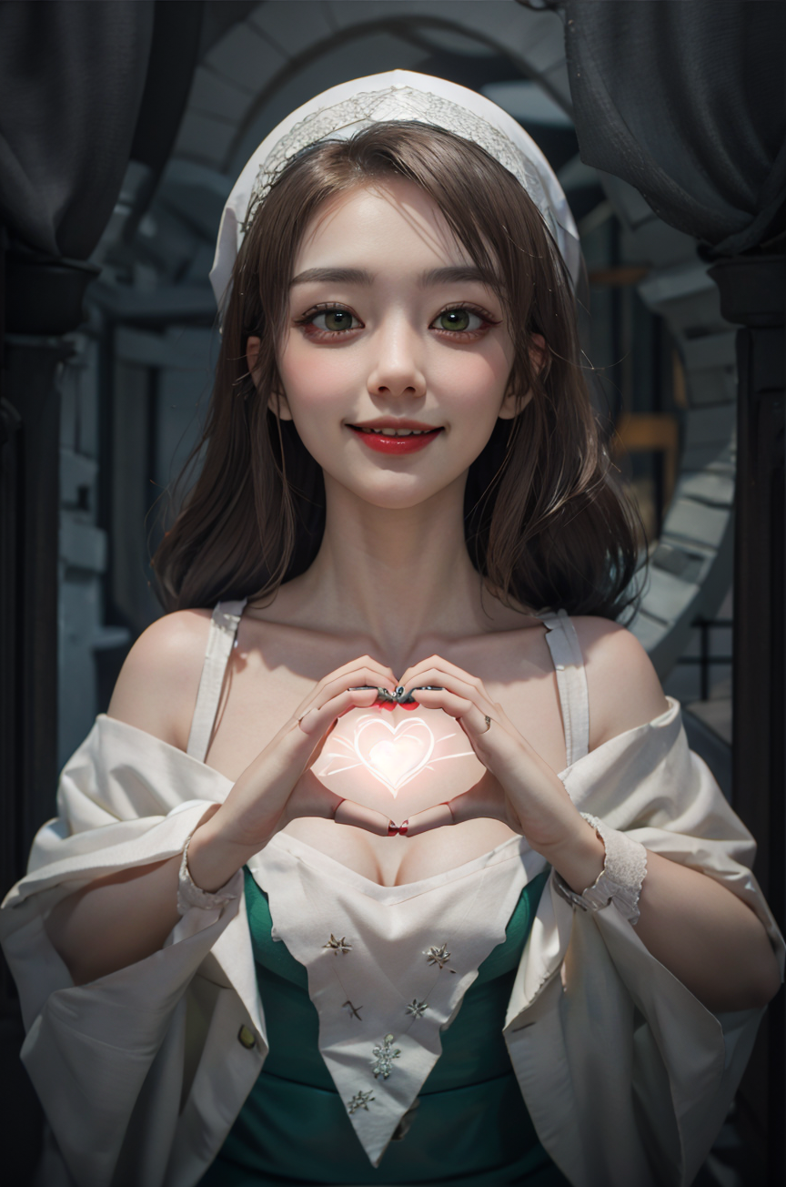 (masterpiece,best quality, detailed), ((heart hands)),indoors, looking at viewer, 1girl, solo, full body, smile, portrait, wariza,suiseiseki, bonnet, head scarf, heterochromia, green dress, neck ribbon, heterochromia, long hair, green dress, neck ribbon, bonnet, head scarf, upper body, portrait, smile,<lora:PerfectNwsjMajic_4:0.7>,PerfectNwsjMajic, <lora:SuiseisekiV1-000008:0.5>