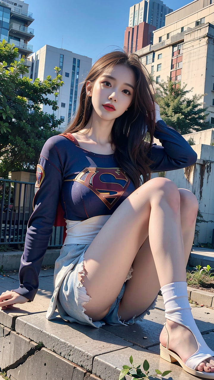 Ultra-realistic 8k CG, masterpiece,full body, The highest quality painting, vivid picture, realistic style, 1girl, sophisticated five senses and make-up, elegant figure, white skin, bruise, dirty, torn clothes, in SKY,ruins,(supergirl),<lora:mix4:0.4> <lora:koreanDollLikeness_v15:0.2> <lora:taiwanDollLikeness_v10:0.2>