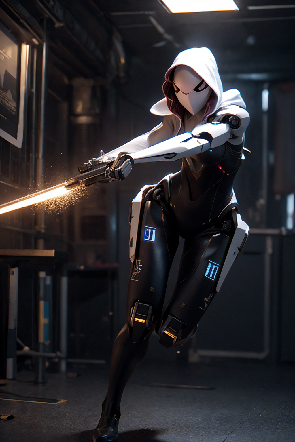 roblit, robot, (RAW photo, 4k, realistic, exquisitely detailed skin), masterpiece, best quality, official art, unity 8k wallpaper, ultra detailed, cinematic look,high saturation,best anatomy, full shot, full body, 1girl, a woman, robot spider-gwen, robot bodysuit, face masked, hood, fighting other character, <lyco:spider_gwen:0.6>, , (best quality, 8k, 32k, masterpiece, UHD:1.2), ultra high res, (photorealistic:1.4), raw photo, <lyco:add_detail:0.3>, <lyco:Mecharobot:0.8>