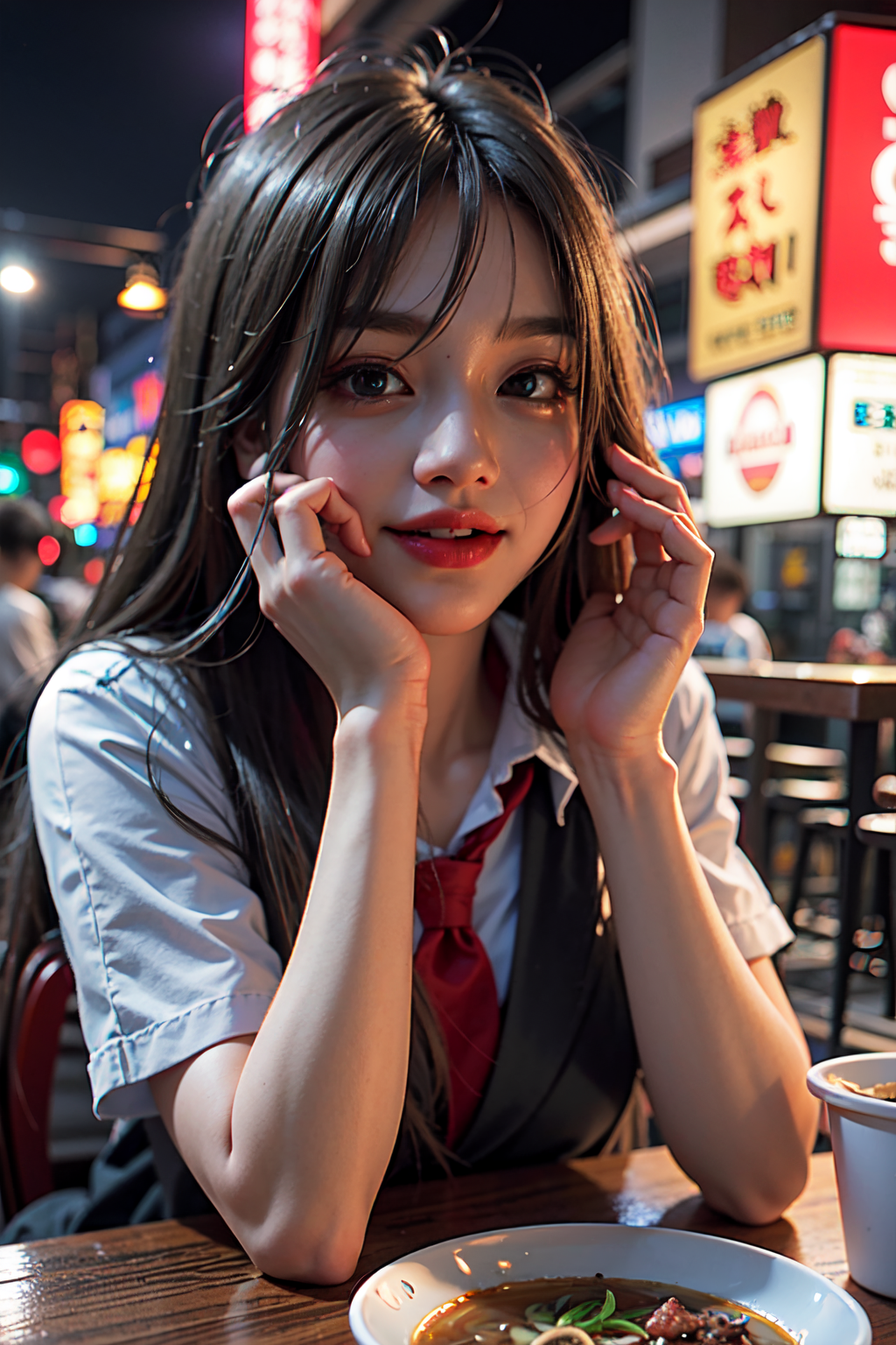 (masterpiece), best quality, ultra high res, close up, slim body, 1girl,school uniform, long hair, laughing, ramen, night, Tokyo restaurant background, colorful lights, photon mapping, radiosity, physically-based rendering, cinematic lighting, intricate, High Detail, Sharp focus, dramatic, photorealistic