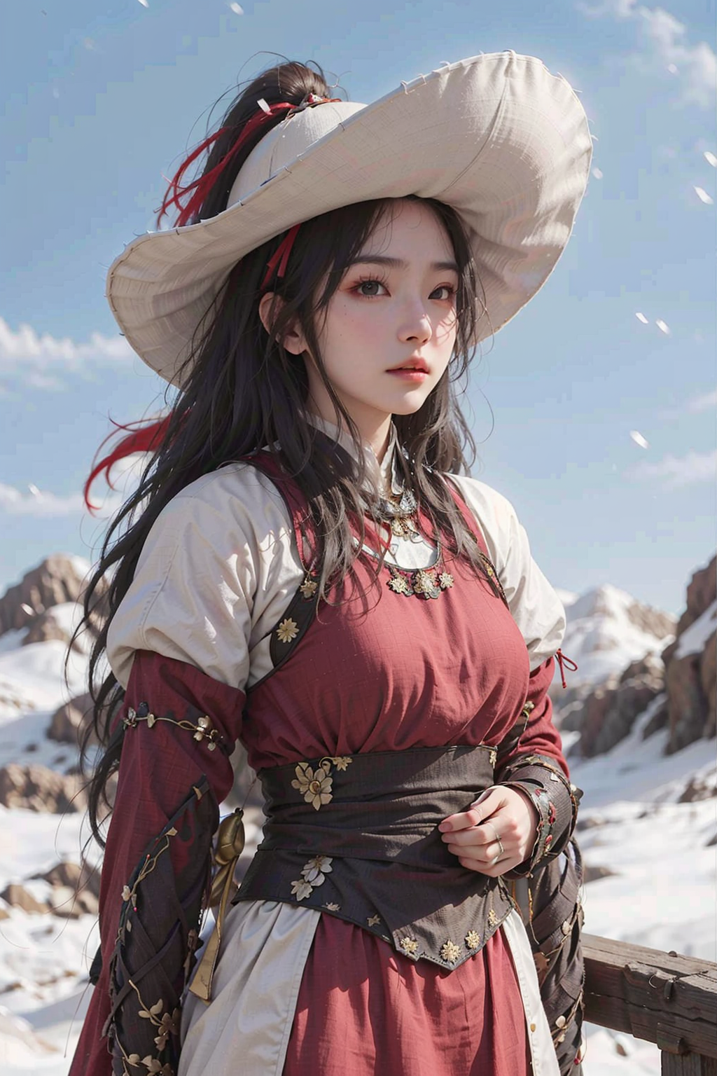 1girl wearing fanyang felt hat, big breasts, red cloak, long hair, armor, masterpiece, best quality, photorealistic, snowing, <lora:fanyang_felt_hat_v2:0.6>