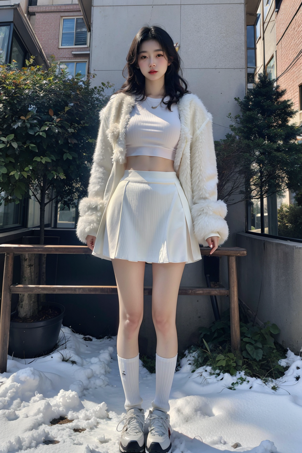 ultra-detailed,masterpiece,finely detail,highres,8k wallpaper,1girl, bare_tree, black_hair, forest, long_hair, nature, ribbed_legwear, snow, solo, tree, winter, skirt, shirt, long_sleeves, standing, jacket, full_body, white_shirt, shoes, socks, midriff, white_footwear, white_skirt, white_socks, Winter Fairy Coquette, outfit<lora:Winter:0.8>