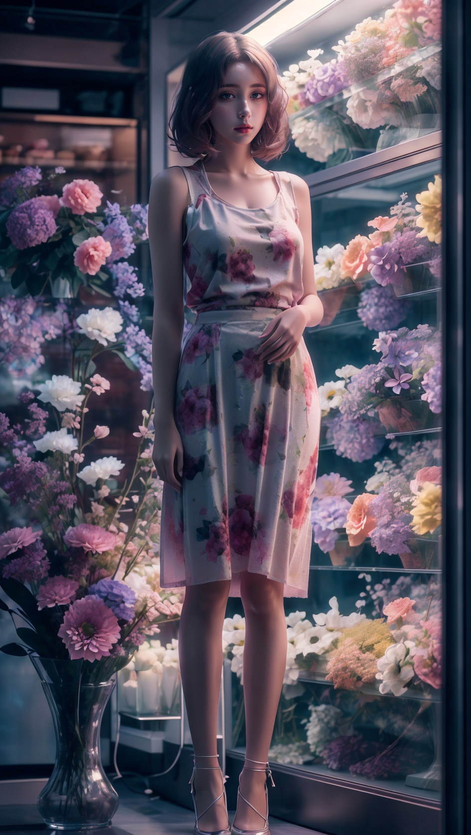 (Master photography:1.4),Full-body photo,(Beautiful and delicate girl:1.2),Beautiful and delicate eyes,Printed skirt,Sweet,serene visuals,Florist at night,Shop window,Quiet,Indoors,Flowers,(Hasselblad:1.2),ray tracing,Close-up,(textured skin:1.3),(UHD:1.1),8k,<lora:Florist at night_20231013231240-000020:0.67>,