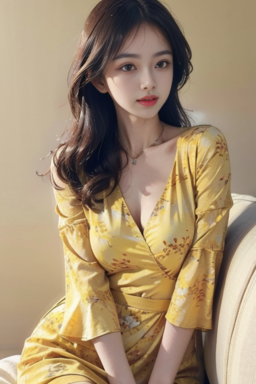 yellow_lure_dress, 8k, cute,(realistic:1.1), (photorealistic:1.1), (masterpiece:1.1), (best quality:1.1), RAW photo, highres, ultra detailed, High detail RAW color photo,professional photograph,masterpiece, best quality,realistic,realskin,1girl,low_key,solo,nighttime,lighting,long hair,(sitting on the sofa),sexy,charming, beautiful detailed eyes,natural lighting,beach,sunset,(nose blush) (detailed face:1.2),extremely beautiful face,cute, beautiful eyes,<lora:yellowLureDress:0.75> , <lora:nwsjmajic:0.75>
