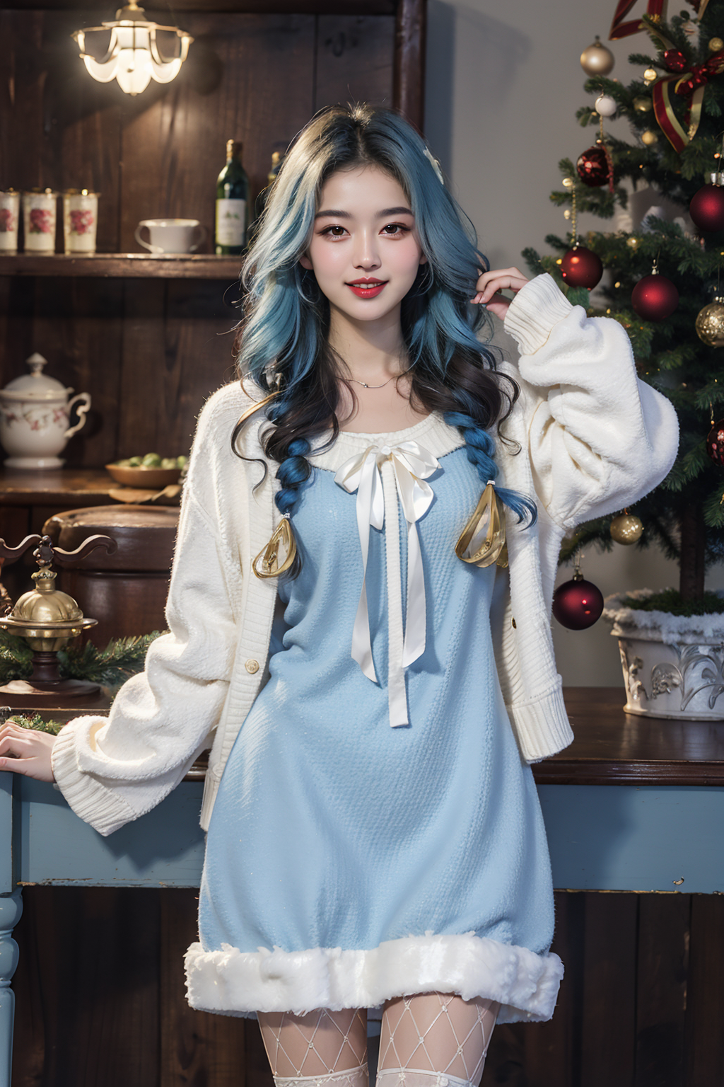 ultra-detailed,masterpiece,finely detail,highres,8k wallpaper,1girl, dress, fishnet_legwear, fishnets, solo, smile, thighhighs, holding, blue_hair, frills, socks, dark_skin, white_dress, twin_braids, dark-skinned_female, lips, christmas, head_out_of_frame, christmas_tree, Winter Fairy Coquette, outfit<lora:Winter:0.8>