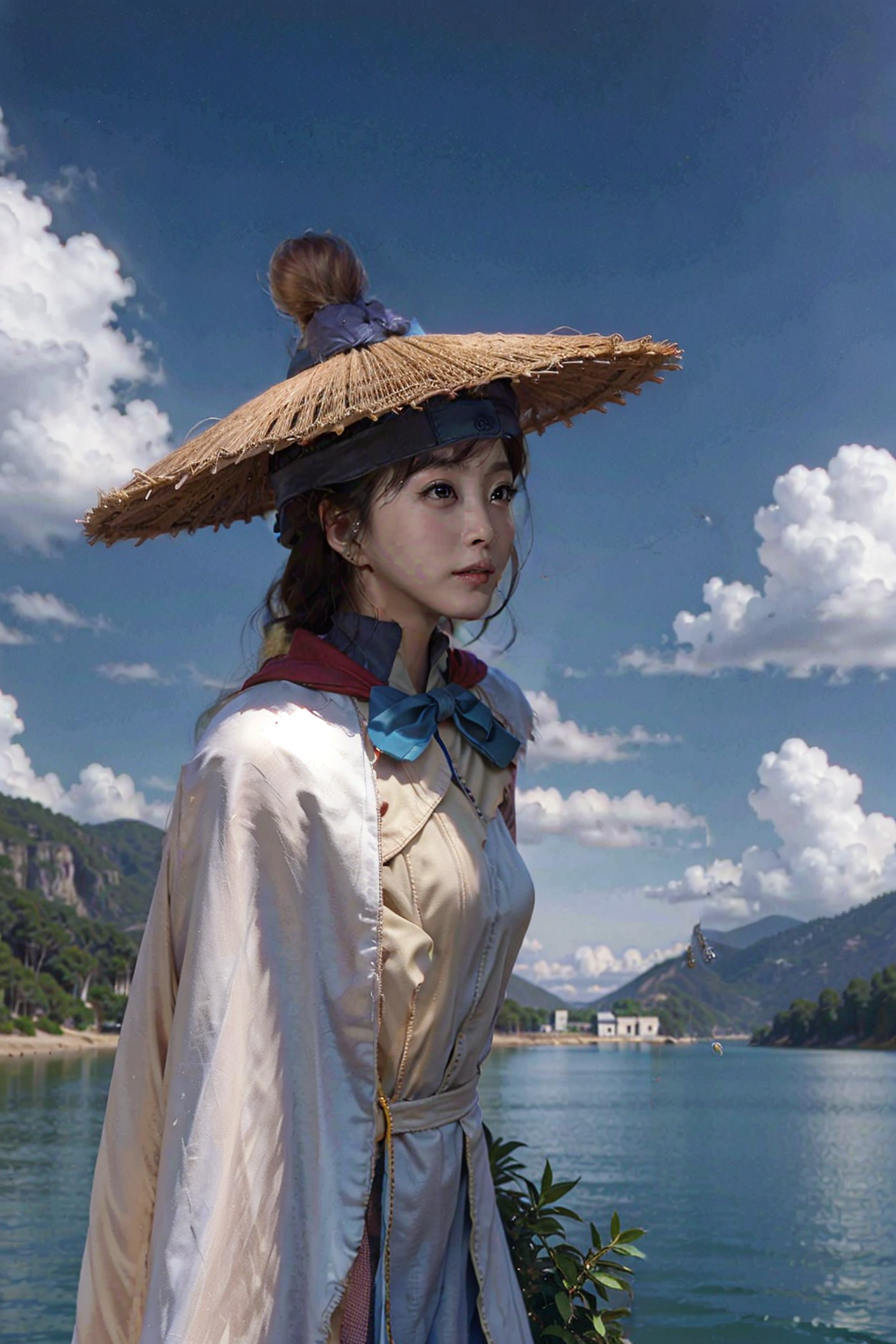 masterpiece, best quality, photorealistic, holding sword, bamboo hat, 1girl, blue_sky, cape, closed_mouth, coat, day, hat, holding, outdoors, sky, solo, standing on raft, <lora:Han_Ye_Seul_v3:1>