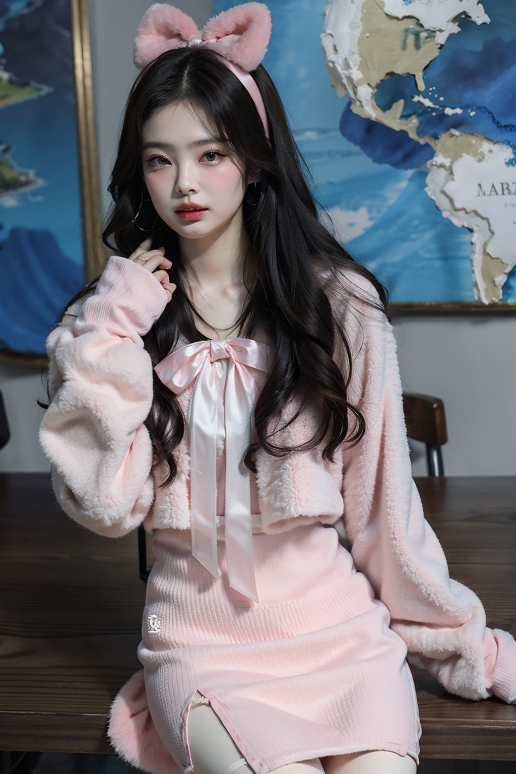 ultra-detailed,masterpiece,finely detail,highres,8k wallpaper,1girl, bow, chair, lips, pink_bow, sitting, solo, table, long_hair, black_hair, long_sleeves, dress, jewelry, pantyhose, earrings, indoors, sleeves_past_wrists, white_pantyhose, realistic, Winter Fairy Coquette, outfit<lora:Winter:0.8>, <lora:makina69_jennie_v1.0:1:face>