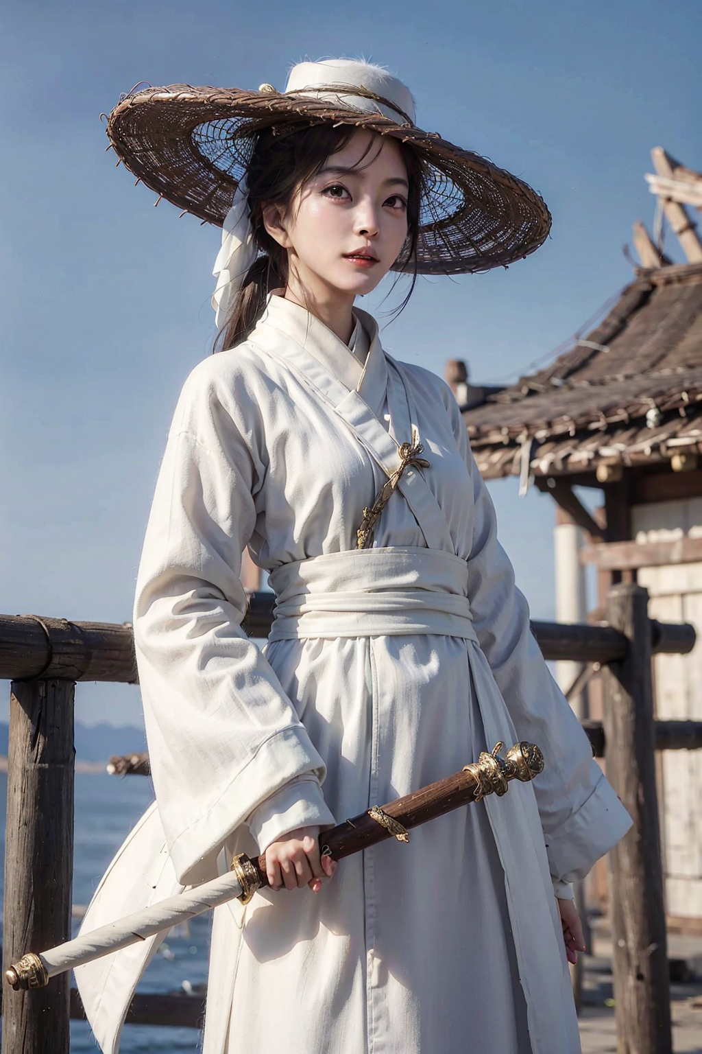 1girl dress like move The Flying Swords of Dragon Gate, white_linen_clothes, furry_coat, bamboo_hat, masterpiece, best quality, 8k, photorealistic, <lora:Han_Ye_Seul_v3:1>