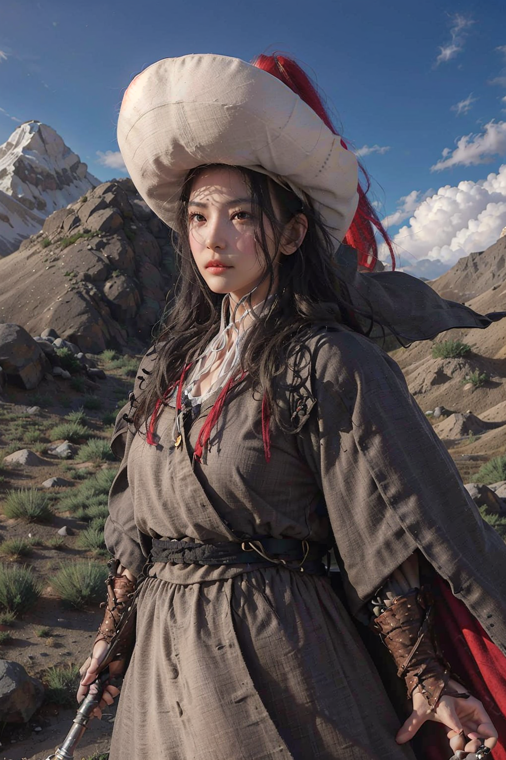 1girl , masterpiece, best quality, photorealistic, fanyangli, <lora:fanyangli_v1:0.78>, big breasts,armor, linen_clothes,cape, furry_coat, day, black_hair, snow, The Great Wall background