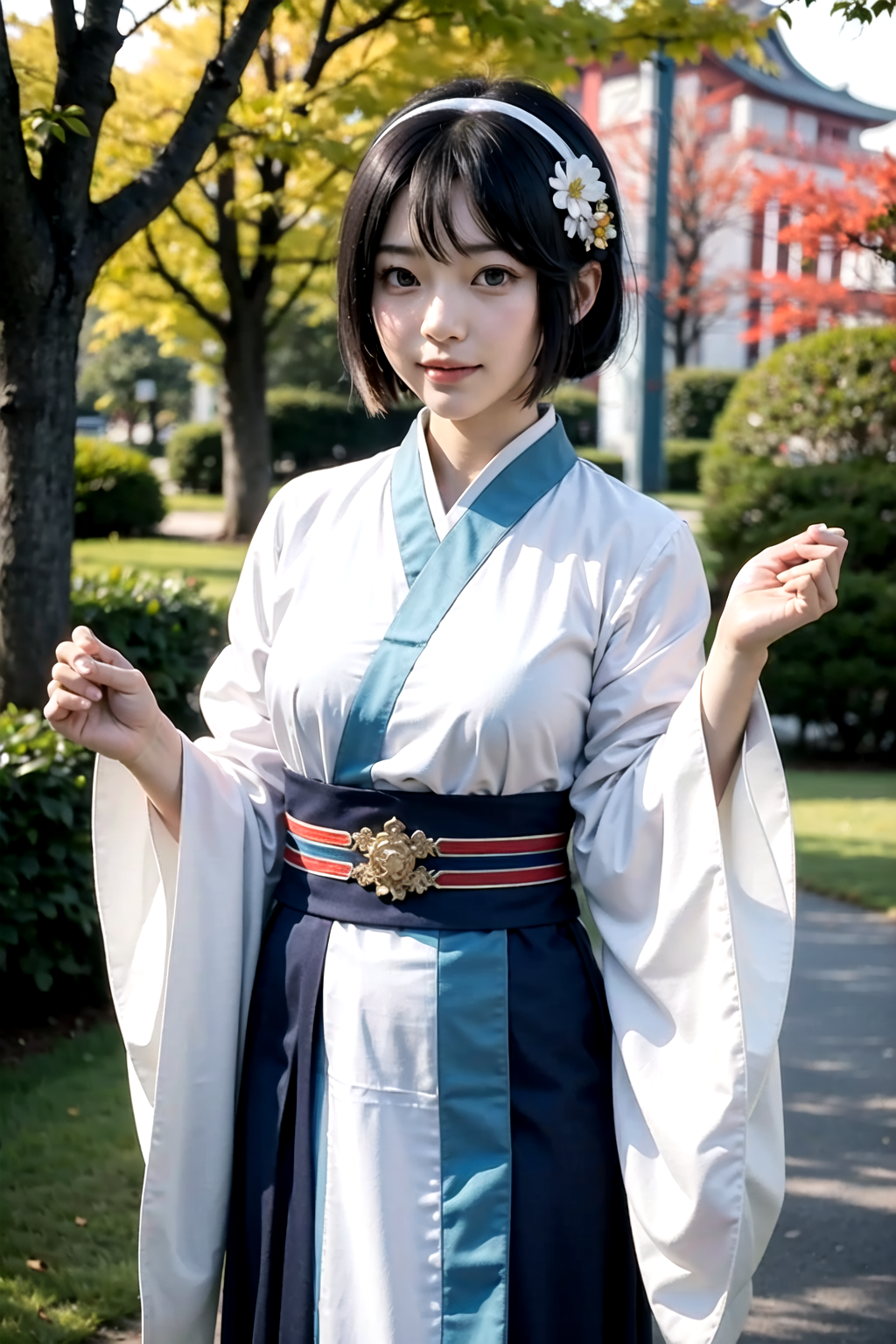 <lora:os-tan_7-tan:0.6>,madobe nanami,nanami,hairclip,hairband,hair ornament,white hanfu,simple background,(:p:1.4),standing in a chinese park