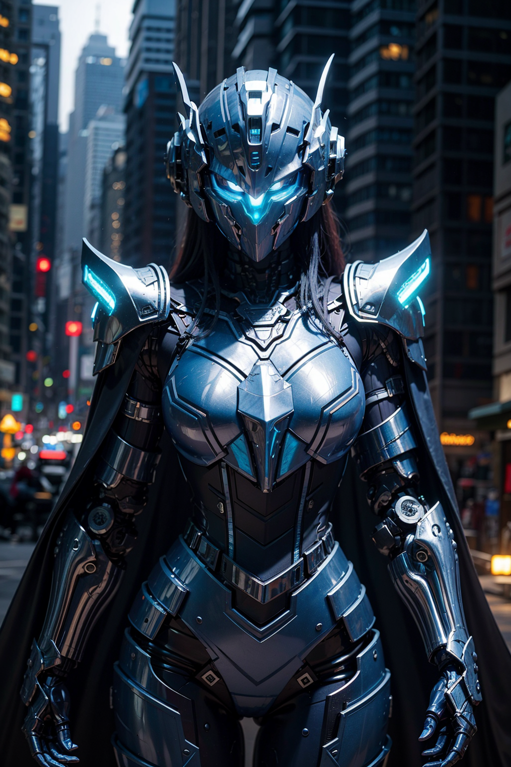 1girl,masterpiece,best quality,ultra-detailed,mecha musume,mechanical parts, robot joints,single mechanical arm, headgear, intricate mechanical bodysuit, full armor, city skyline, full helm, mask, cloak, glowing blue eyes <lora:A-Mecha-REN:1>