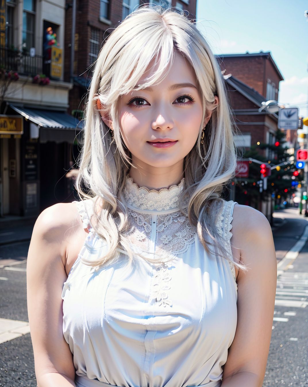 a woman posing on the street corner with white dress on, best quality, high res, 8k, 1girl, (huge breasts), day, bright, outdoor, (street:0.8), (people, crowds:1), (lace-trimmed dress:1.5, white clothes:1.5, white high-neck dress:1.5, sleeveless dress, white dress: 1.5), gorgeous, (wavey hair,white hair:1.5), beautiful detailed sky, beautiful earrings, (dynamic pose:0.8), (upper body:1.2), soft lighting, wind, shiny skin, looking at viewer, smile, (closed mouth:1.5), <lora:JAV_Rina_I_v1.0:0.65>