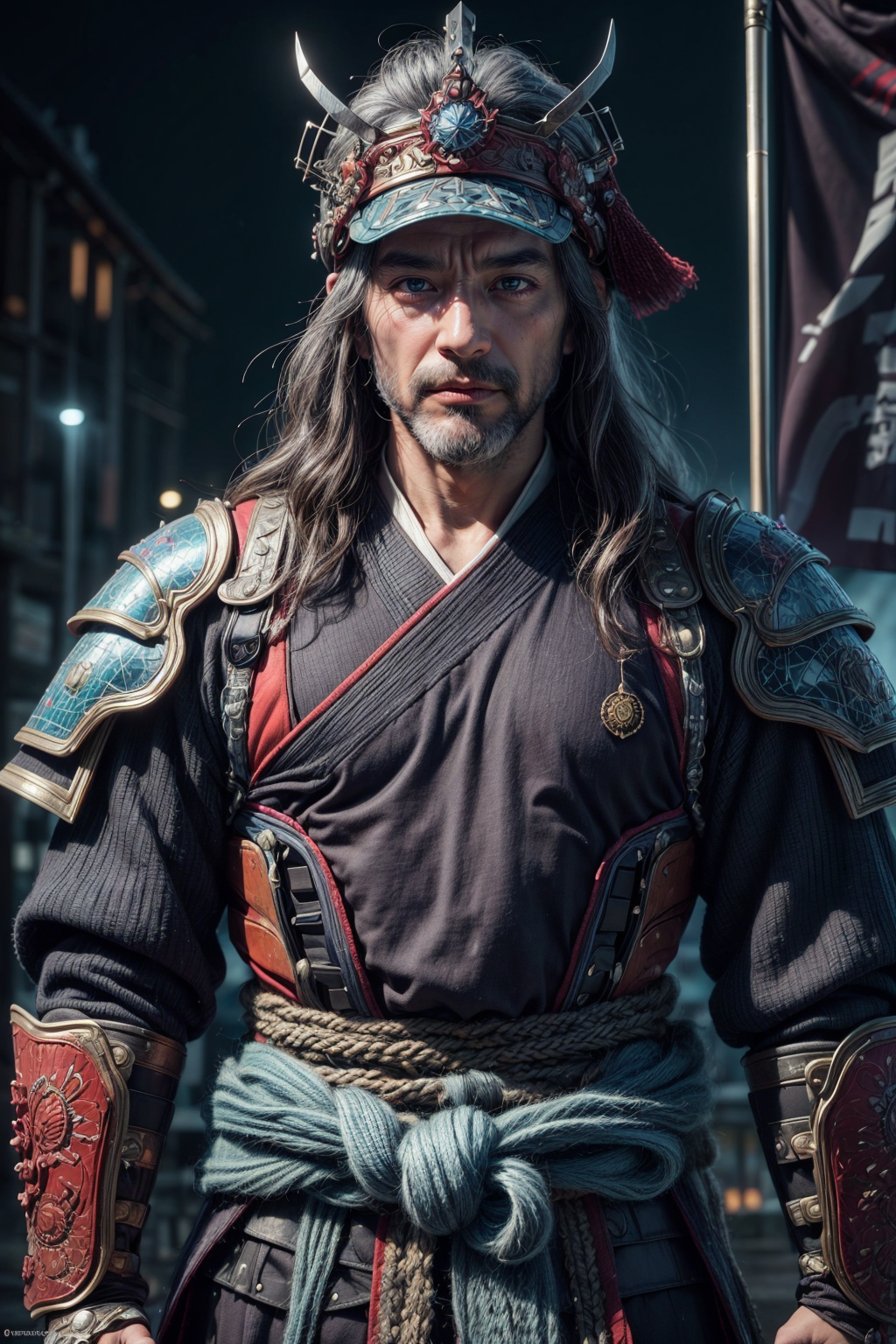 best quality, masterpiece, ultra high res, (photorealistic:1.4), raw photo, <lora:add_detail:1> (1man, old male:1.2), wise, light blue eyes, gray hair, fade, portrait, solo, upper body, looking up, detailed background, detailed face, (<lora:NodesTech:0.6>, holographic, NodesTech theme:1.1), shogun, green samurai armor, samurai helmet, dynamic pose, angry, samurai crest, bushido, banner in background, cinematic atmosphere, <lora:PsyAI_128:0.4>, PsyAI,