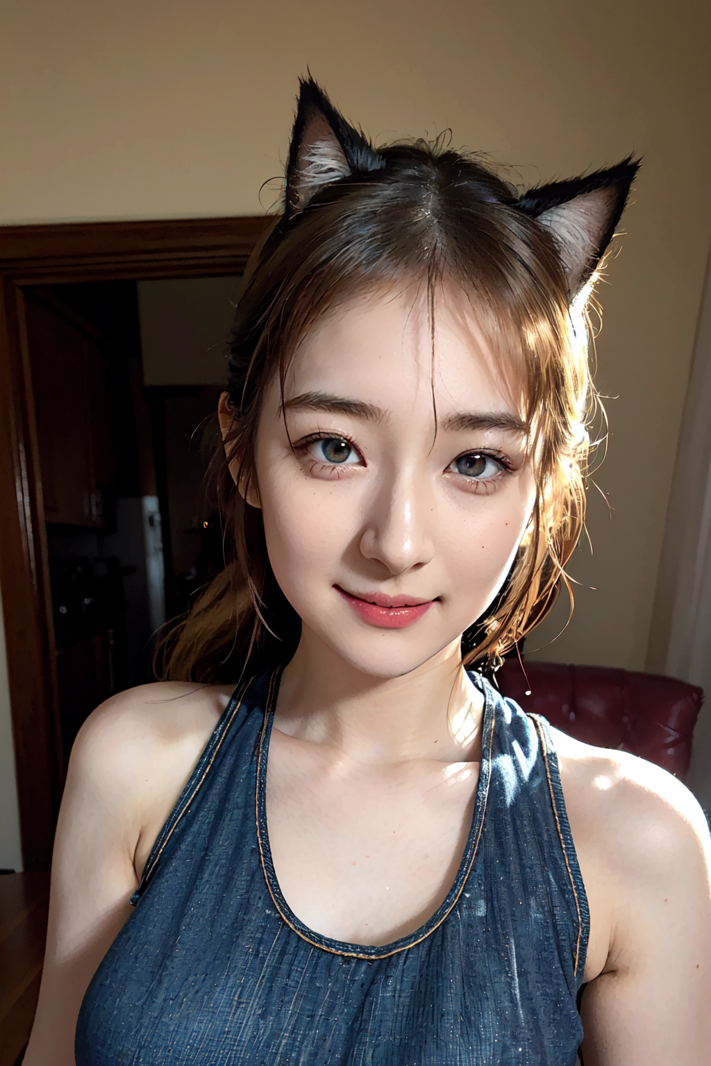 <lora:suehiro_v1:0.8>, suehiro 25 years old , pale skin, slim, cute face, brown eyes, ((dark denim tank top)), blonde hair, long hair, cat ears, (detailed eyes features:1.2), (detailed face features:1.2), full body, portrait shot, smile, look at camera, natural breasts, morning, in the farm, extreme realistic, depth of field, natural lighting, 8k, post-processing, ultra high res, (photorealistic:1.6), (masterpiece:1.3), (RAW photo:1.2), Fujifilm XT3, DSLR, <lora:Arknights-Texas the Omertosa:0.25>