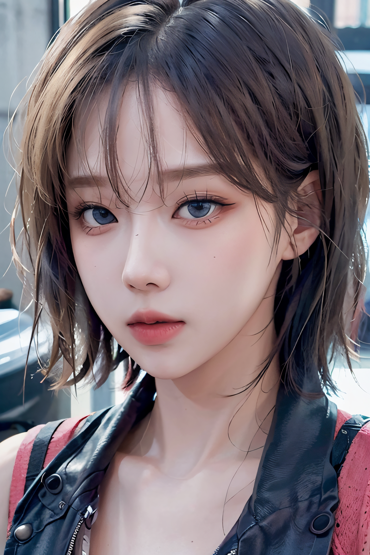 Best quality, masterpiece, ultra high res, (photorealistic:1.4), raw photo, 1girl, short black hair, makeup, blue eyes, smoky eyes, pout