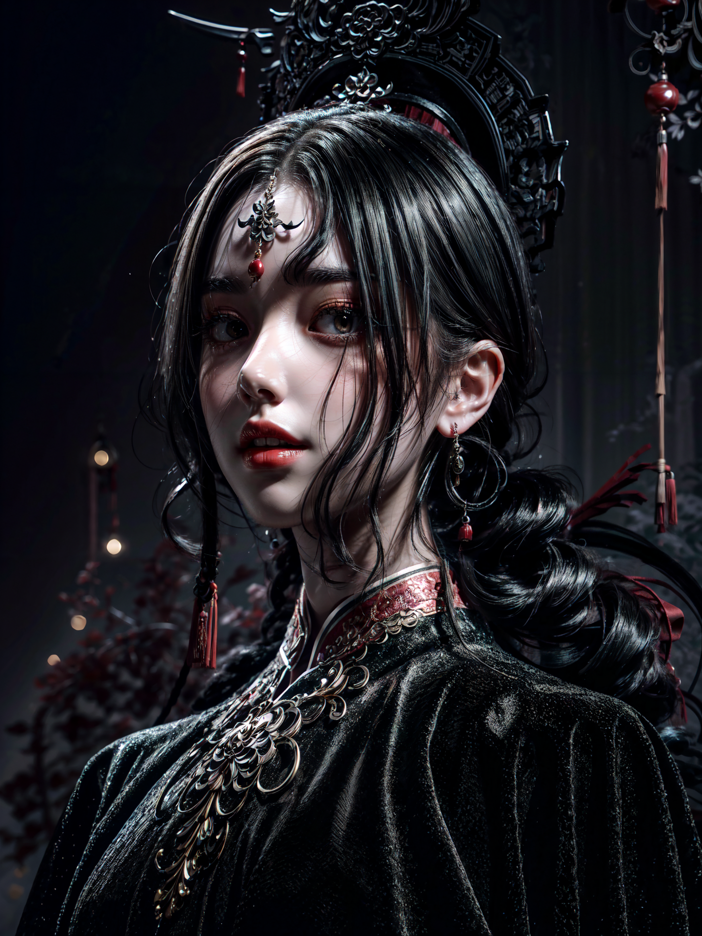 (masterpiece),best quality,panorama,(wide shot),(full_shot:1.1),long hair with slight curls,1girl,solo,(black hair),red jewelry,earrings,long hair,(black eyes:1),makeup,