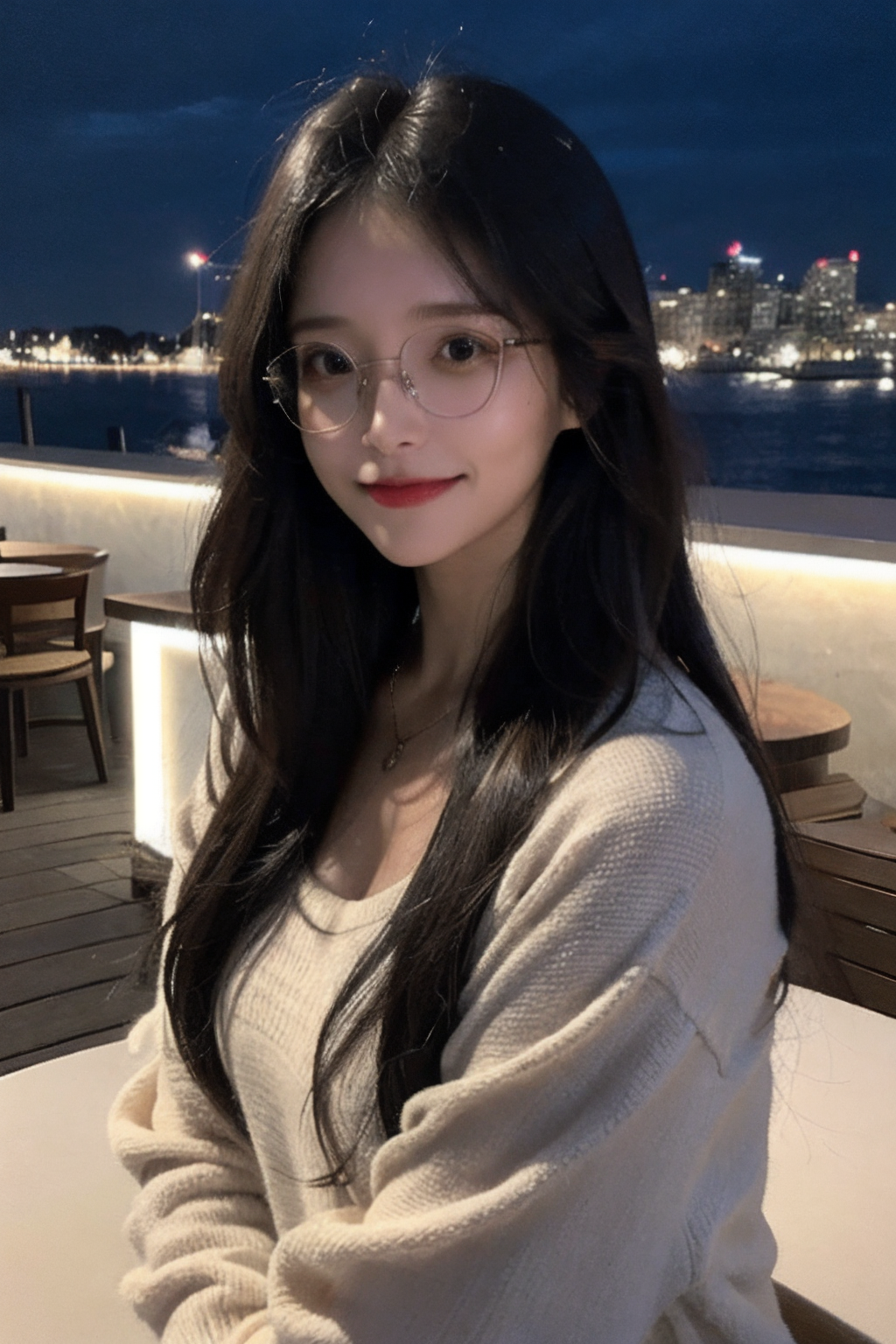 <lora:Gini_S2:0.4>, (RAW photo, best quality), (realistic, photo-realistic:1.2), (round face:1), a woman, shopping mall rooftop cafe, outdoor, smile, (high detailed skin:1.4), puffy eyes, gorgeous hair, glasses, air bangs, brown black hair, soft lighting, high quality, cityscape, night, sea, physically-based rendering, <lora:tingting:1.2>,small chest