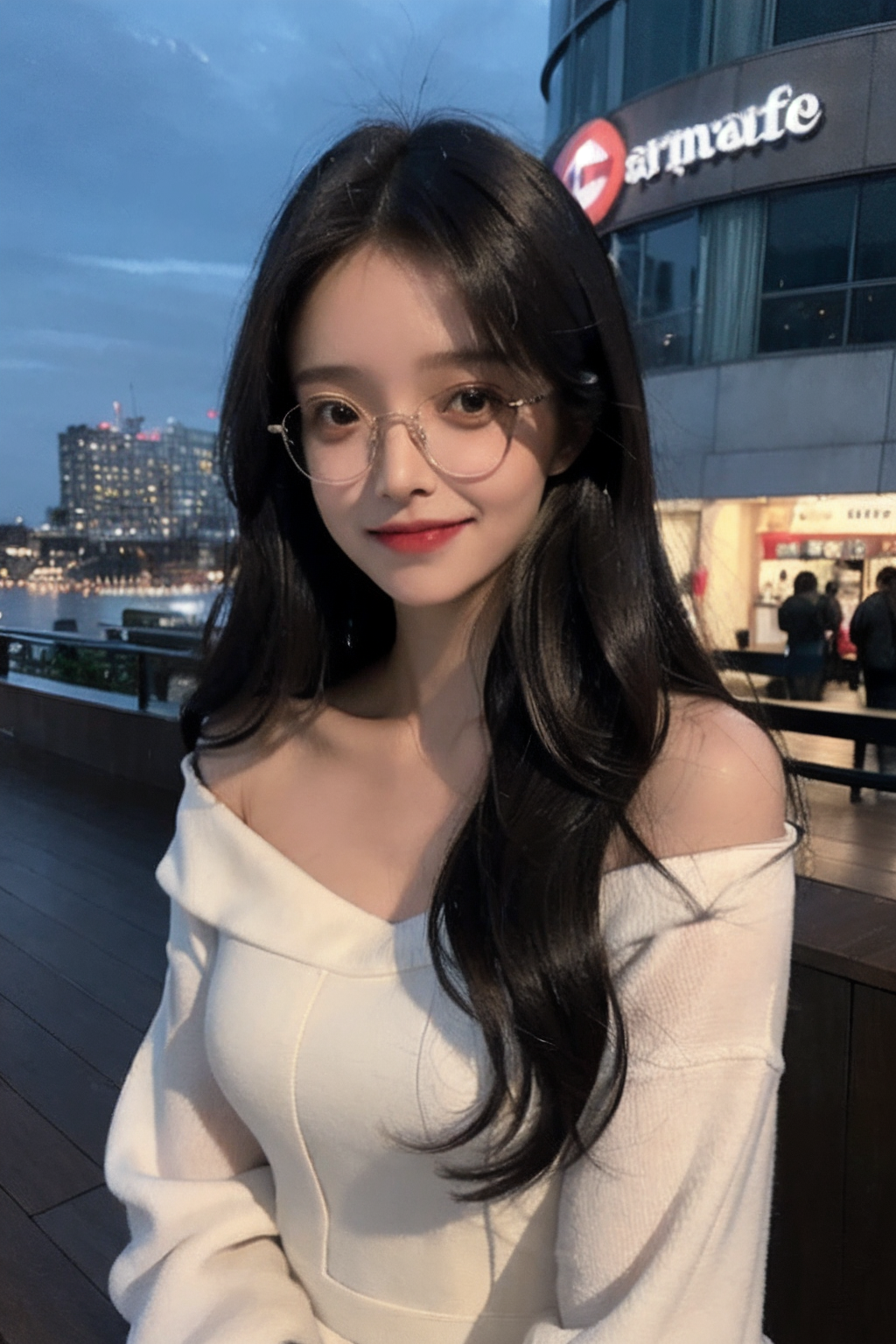 <lora:Gini_S2:0.4>, (RAW photo, best quality), (realistic, photo-realistic:1.2), (round face:1), a woman, shopping mall rooftop cafe, outdoor, smile, (high detailed skin:1.4), puffy eyes, gorgeous hair, glasses, air bangs, brown black hair, soft lighting, high quality, cityscape, night, sea, physically-based rendering, <lora:tingting:1.2>,small chest