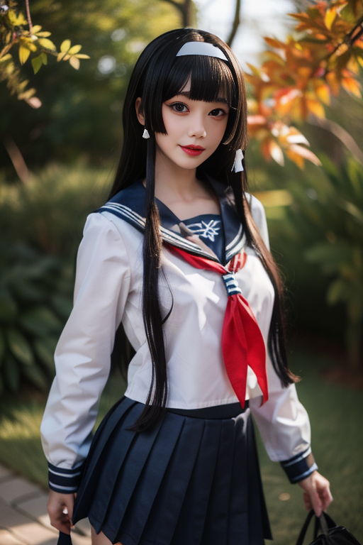 ltra-detailed,highly detailed,best quality,masterpiece,illustration,realistic,photorealistic, renge, cosplay, solo, 1girl, cosplay, school uniform, serafuku, sailor collar, long sleeves, neckerchief, pleated skirt, long hair, bangs, sidelocks, hairband, hair tubes, headband, looking at viewer, upper body, outdoors, photo background, <lora:renge_jk_v1_10:0.7>
