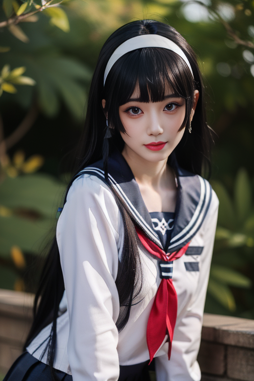 ltra-detailed,highly detailed,best quality,masterpiece,illustration,realistic,photorealistic, renge, cosplay, solo, 1girl, cosplay, school uniform, serafuku, sailor collar, long sleeves, neckerchief, pleated skirt, long hair, bangs, sidelocks, hairband, hair tubes, headband, looking at viewer, upper body, outdoors, photo background, <lora:renge_jk_v1_10:0.7>