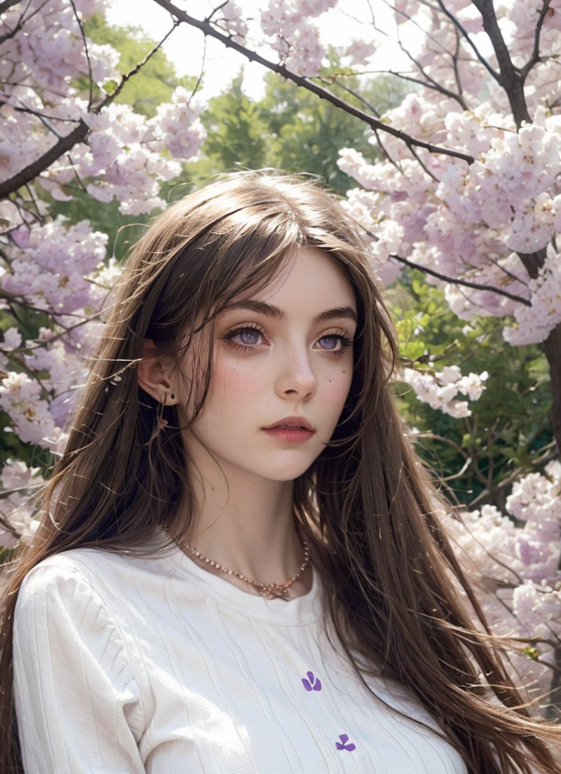 1girl, solo, upper body, looking at viewer, long hair, purple eyes, Shy, Cute Girl, in Woods, <lora:Jess:0.68> <lora:WGirls-02:0.78> <lora:breastsizeslideroffset:0.32>