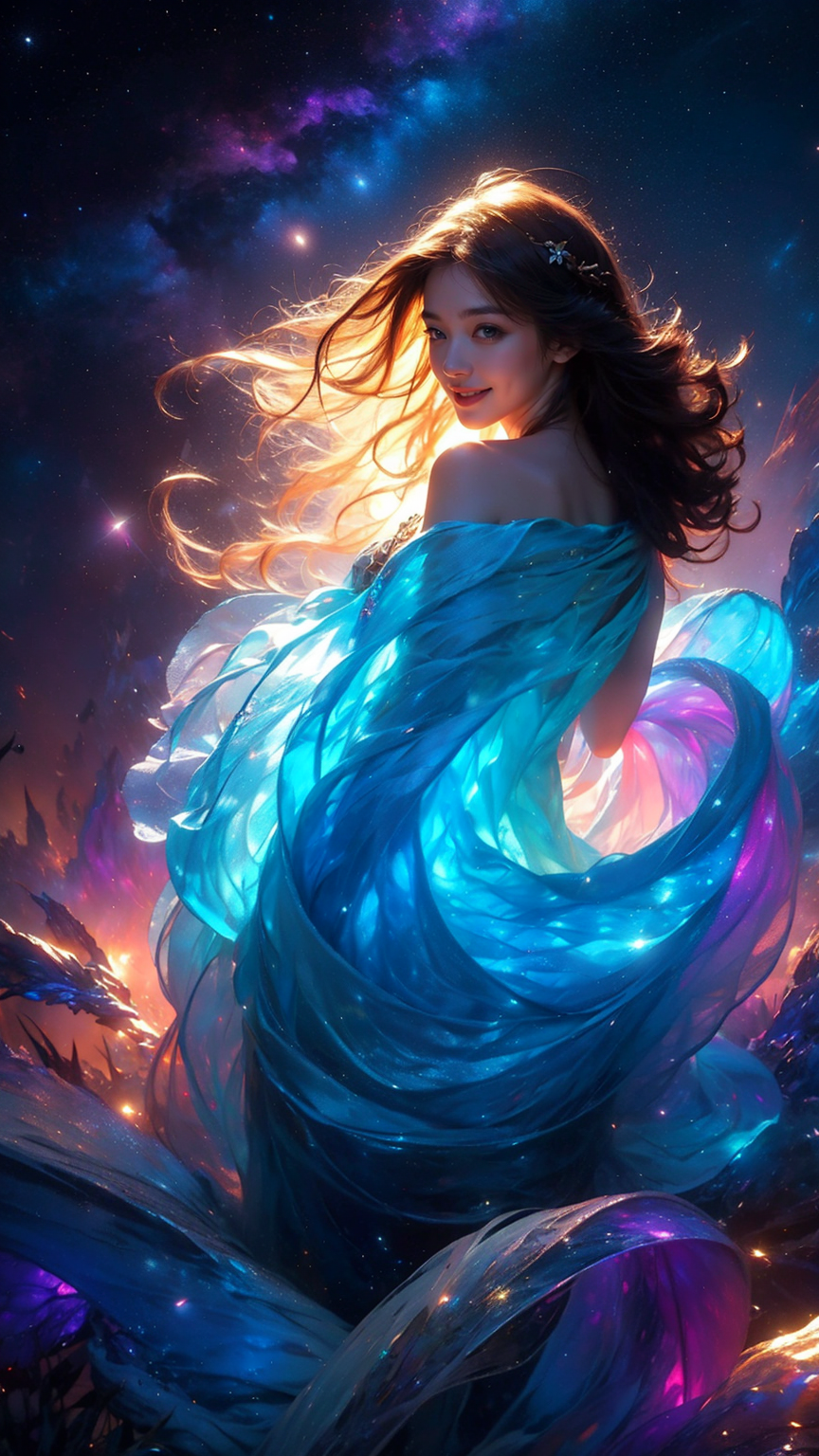 masterpiece,best quality,aesthetic,detailed face,subsurface scattering,side view up, wrenchsfantasy,fantasy,1girl,photo of a cute girl,light smile,charming,20yo,Curly hair.crew cut,Bronze hair,glowing,cloud,colorful || starry,stars, space_style,style-swirlmagic,style-sylvamagic,rainbow-candy, <lora:wrenchsfantasy-000016:0.8>,<lora:sunAndShadow_v10:0.6>, celestial, adorable
