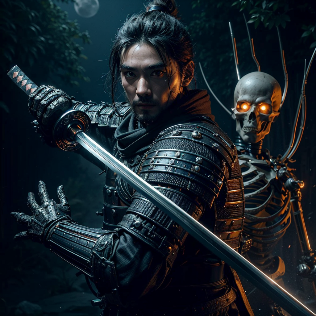 a male japanese samurai with katana, a skull soldier at back, dark background with some moon light, at japanese style garden, masterpiece, 8k, uhd, extremely detailed, dynamic pose, great anatomy, perfect body shape, perfect limbs, perfect hands, hyperrealistic, phtorealistic