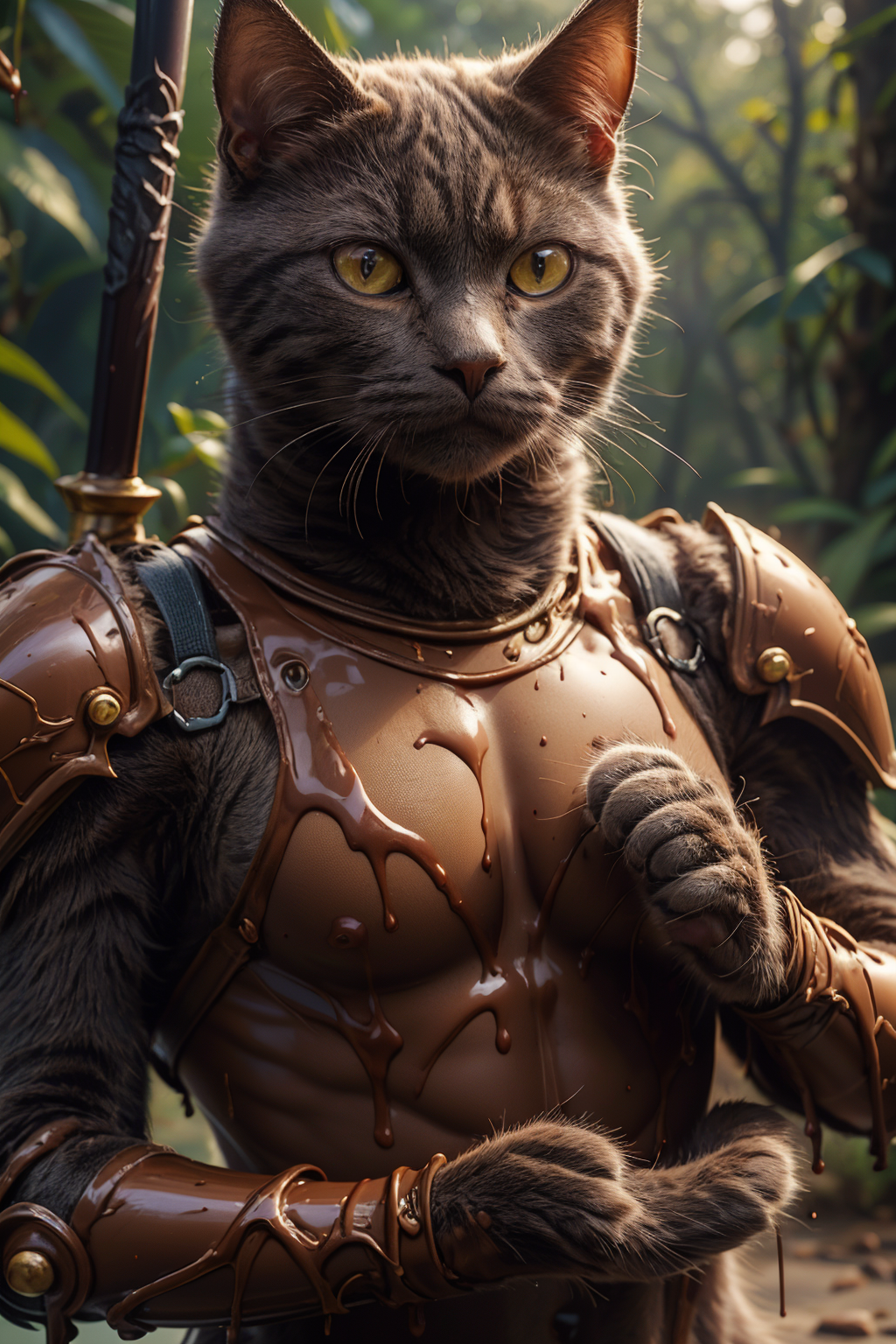 highres, 8k, absurdres, realistic, ChocolateWetStyle, (Chartreux:1.3), (cat_human:1.55), (cat:1.4), animal_focus, outdoor, chocolate cat, chocolate armour, warrior, holding a long sword, chocolate forest, tree, ((close up)), fine fabric emphasis, <lora:Chartreux_v3-000010:0.35> , <lora:ChocolateWetStyle:0.55>