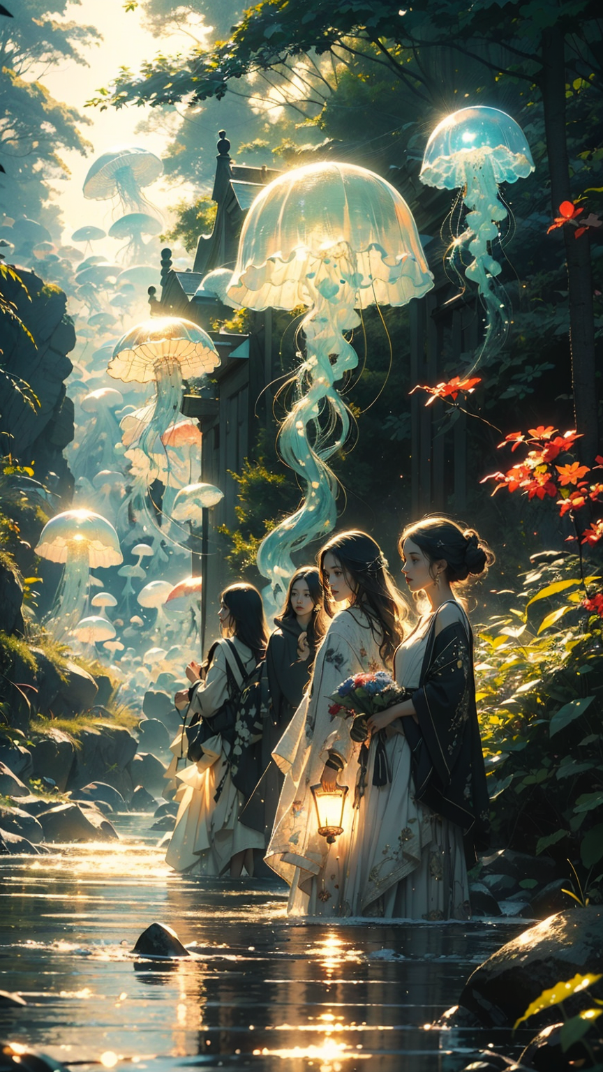 high quality, realistic, official art, unity 8k wallpaper, ultra detailed, beautiful and aesthetic, masterpiece, best quality, green jellyfish,(jellyfishforest:1.4), mushroom, dress, long hair, scenery, white dress, solo, nature, water, wading, outdoors, tree, standing, black hair, fantasy, forest, <lora:jellyfish-noise:1>, <lora:decolorization:0.8>, <lora:add_brightness:0.6>