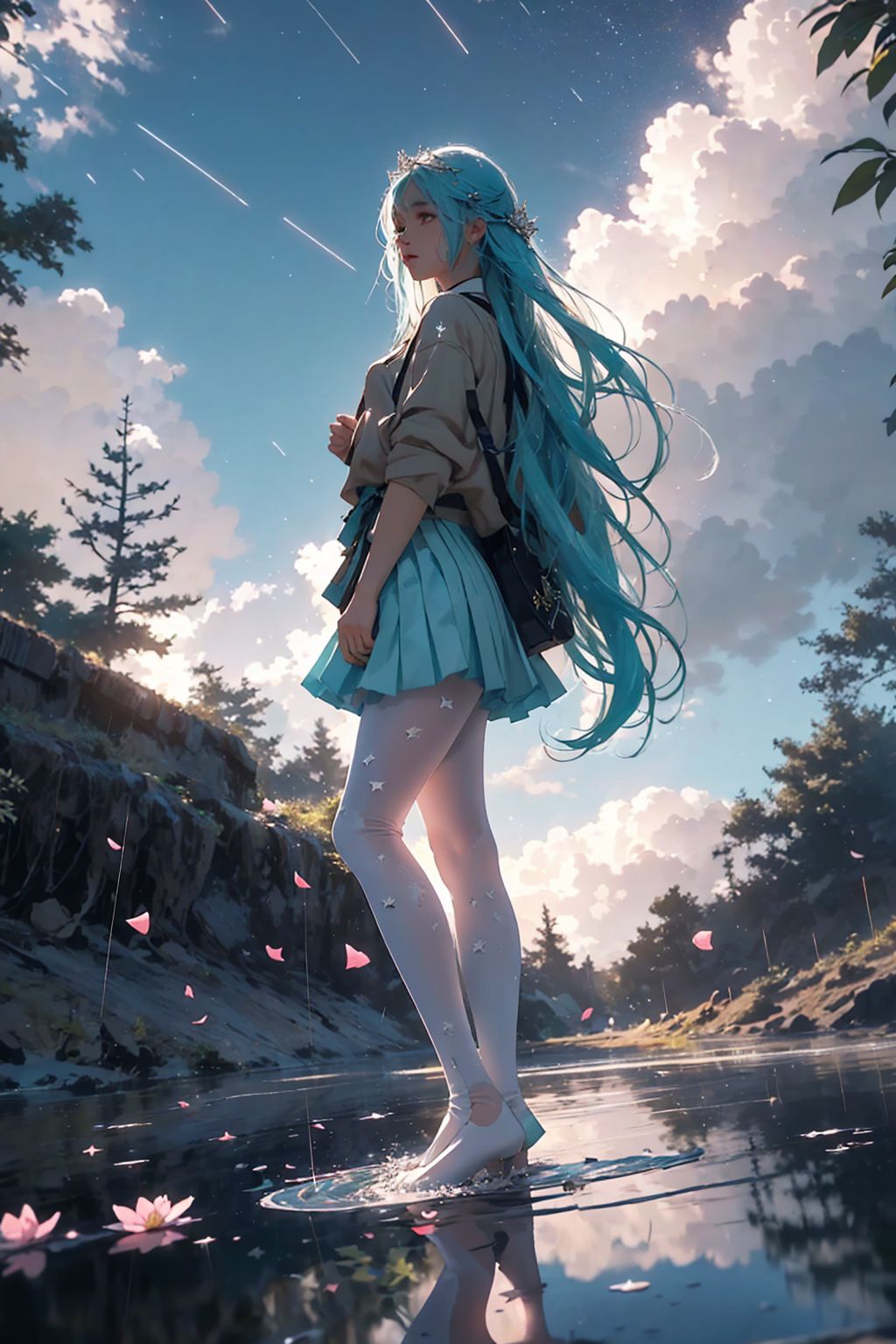 masterpiece, best quality, <lora:rain_style:0.65>, rain style, 1girl, long hair, solo, sky, reflection, cloud, very long hair, skirt, star \(sky\), ripples, outdoors, shooting star, starry sky, aqua hair, pantyhose, pleated skirt, scenery, water, standing on liquid, reflective water, hair ornament, tree leaf, petal, from below,