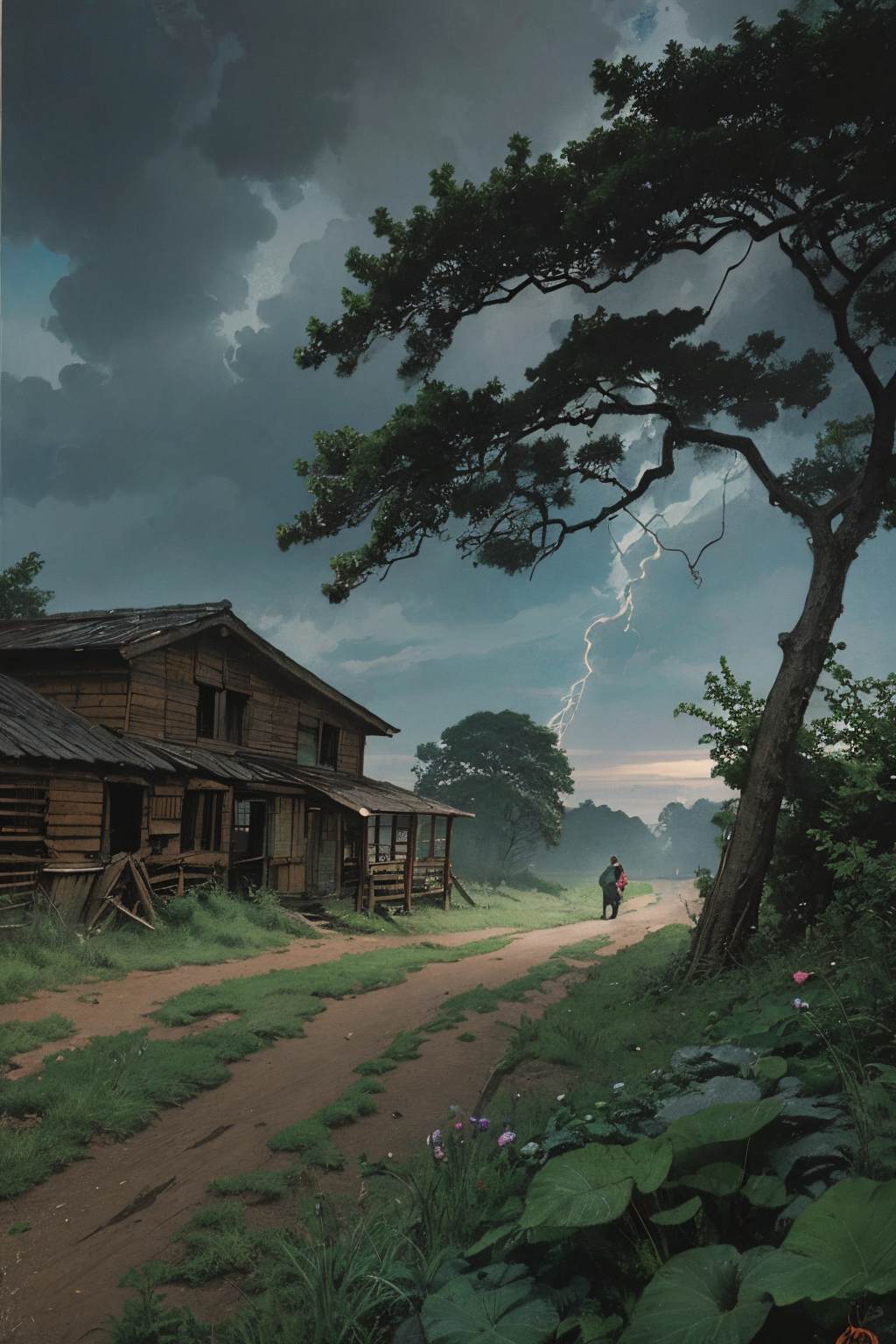 (art by Arthur Stanley Wilkinson:0.9), landscape of a Abandoned a painting, Dense vegetation, Thunderstorm, Cosy, Process Art, Vivid Colors, <lora:youzhiworldV2:1>