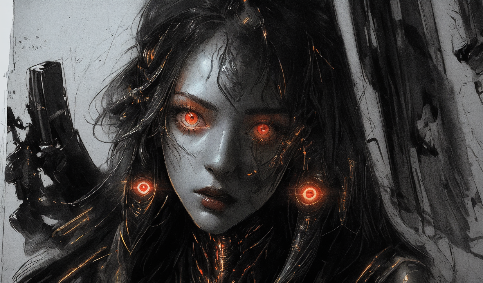 (sci-fi story ink print :1.2),(red shiny lips),glowing eyes, (sketch:1.5),(a photo of ink print sketch),(Wonderful female cyborg sketches:1.3),(Parts Description:1.4), (detailed explanation and description, text, production drawing),(documentation:0.8),Design Process,high-tech,action, <lora:insanevoid2:1.0>