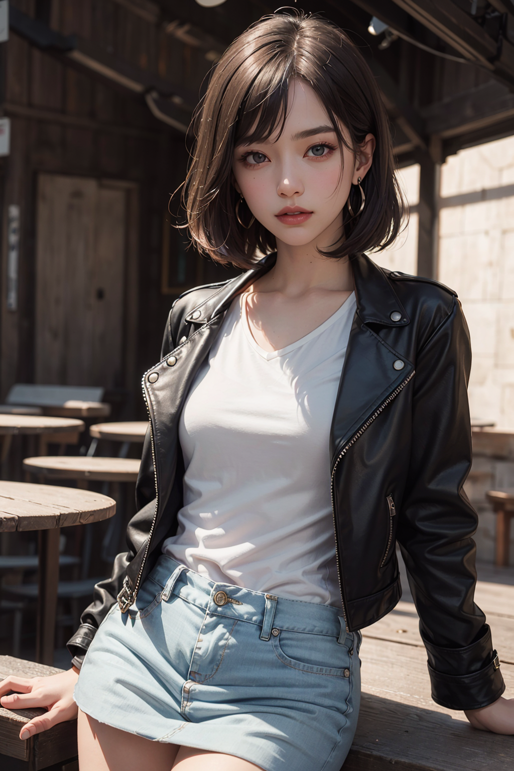 1girl, bob cut, brunette, straight hair, earrings, black leather jacket, white blouse, denim skirt, swept bangs, (small breasts), the pose, upturned eyes, masterpiece, top quality, best quality, official art, unity 8k wallpaper, highres, ultra-high res, ultra-detailed, beautiful and aesthetic, perfect detailed face, detailed eyes, highly detailed, (photorealistic:1.2), confident and sophisticated woman, ice queen, mature female, detailed and realistic, (depth of field:1.4), kamakura \(city\), Vibrant Color Palette, Detailed and Realistic, Light and Shadow, Emotional Lighting, Immersive Visuals, Luminous and Atmospheric,