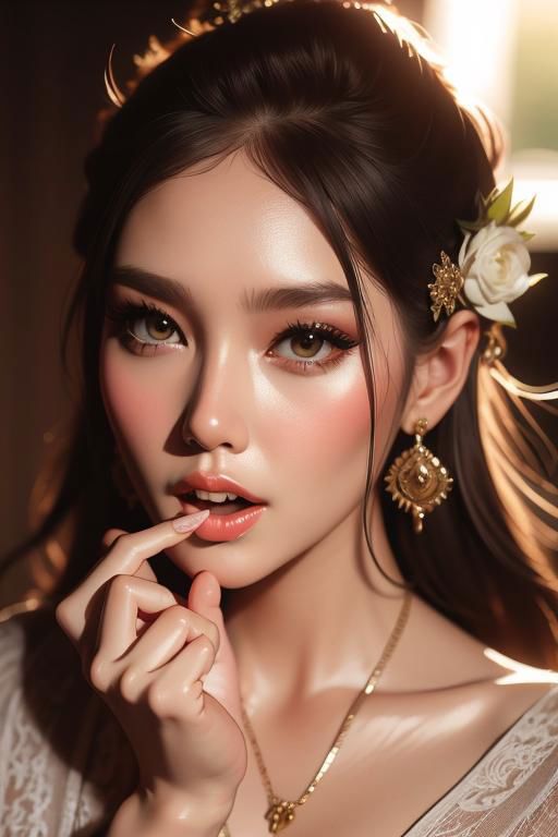 dramatic light,bella ranee ,detailed background, Depth of Field, volumetric light, crisp focus, Absurd, realistic proportions, good anatomy, (Realistic, hyperrealistic:1.4), HDR 16K, staring at the viewer, intricate details, highly detailed, (Licking the own finger:1.4)