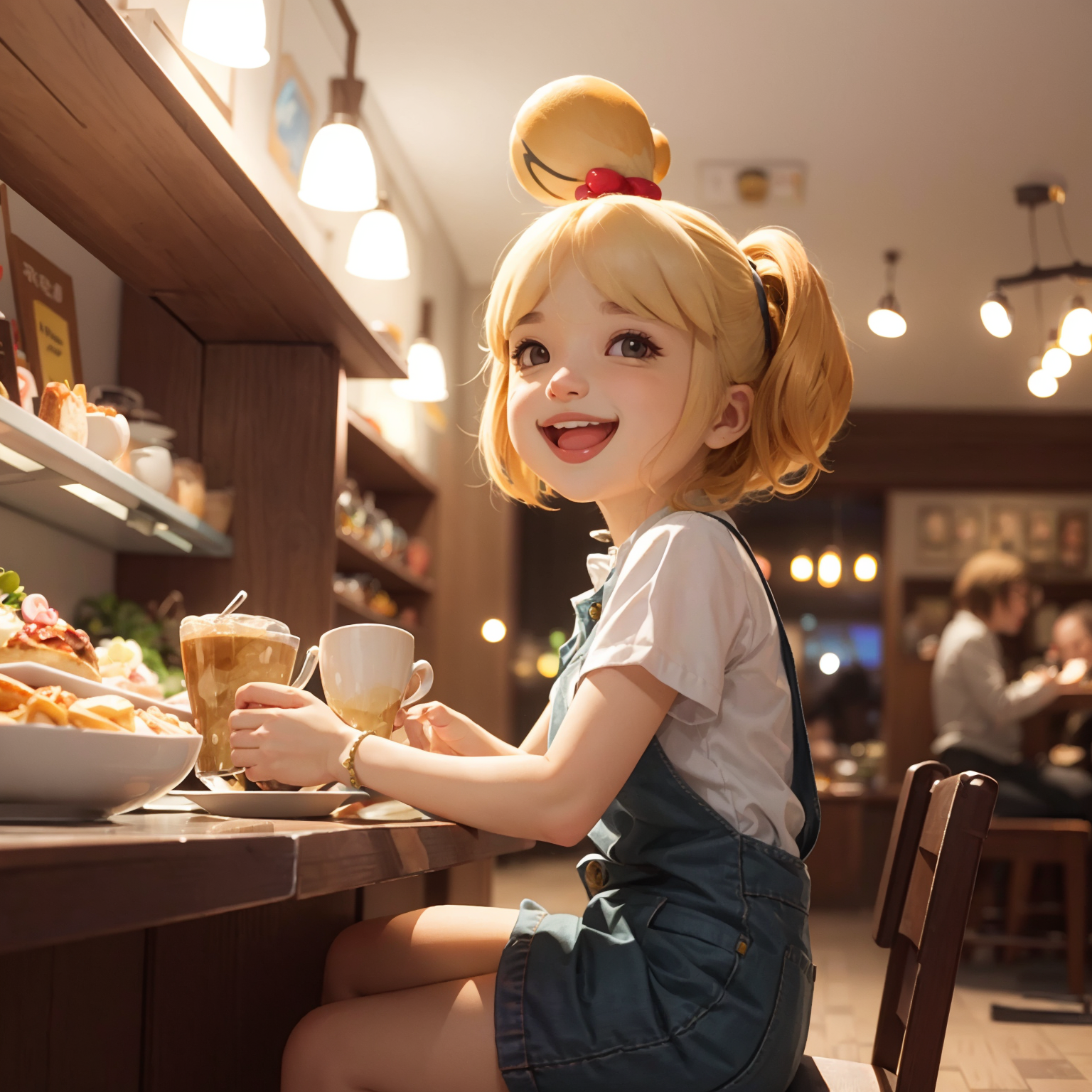 masterpiece, best quality, isabelle \(animal crossing\), smile, 1girl, open mouth, topknot, solo, animal ears, happy, CAFE, sitting, from side, <lora:shizue_Isabelle:0.6>