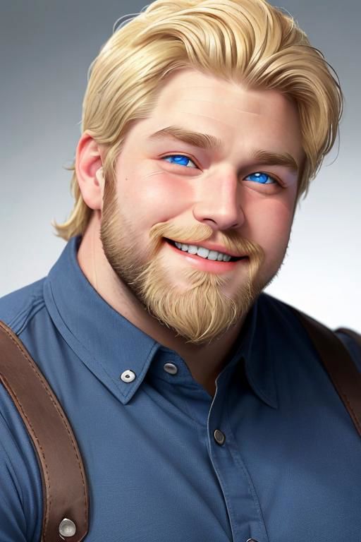 blue eyes, blonde, beefy, bearded, handsome, chubby, rascal, lecherous, flirtatious smiling look, face, male, realistic,