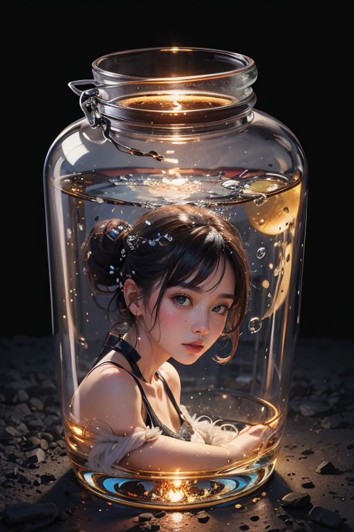 masterpiece,best quality,8k,original,official art,photorealistic,raw photo,photores, 1girl,glass bottle,Girl floating in the water,a bottle full of water,air_bubble,style-swirlmagic,asian-girl,<lora:ç¶ä¸å°å¥³_ç»çå¨ç¿æ¦å¿µlora_1.0:0.7>,
