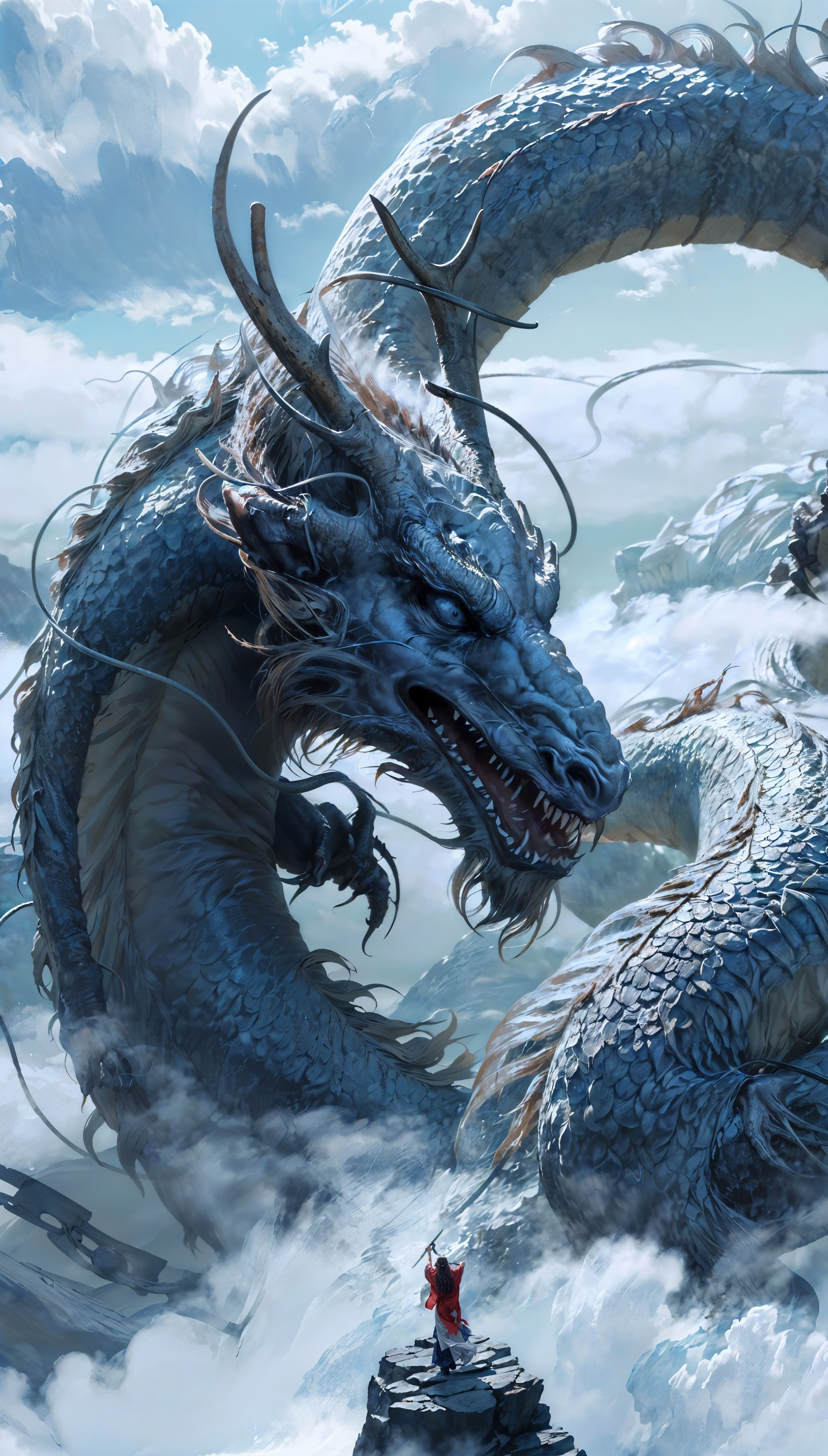 (RAW photo, best quality), (realistic, photo-realistic:1.3), extremely delicate and beautiful, Amazing, finely detail, masterpiece, ultra-detailed, highres,(best illustration), (best shadow),intricate, A beautiful female Taoist priest stands atop a mist-shrouded mountain peak, her right hand raised diagonally, wielding a long sword,from back,in front of a Chinese loong,(loong:1.4),clouds,storm,mountains,sunset, sharp focus, volumetric fog, 8k UHD, DSLR, high quality, (film grain:1.4), Fujifilm XT3, <lora:add_detail:1> <lora:loong2-000015:1>