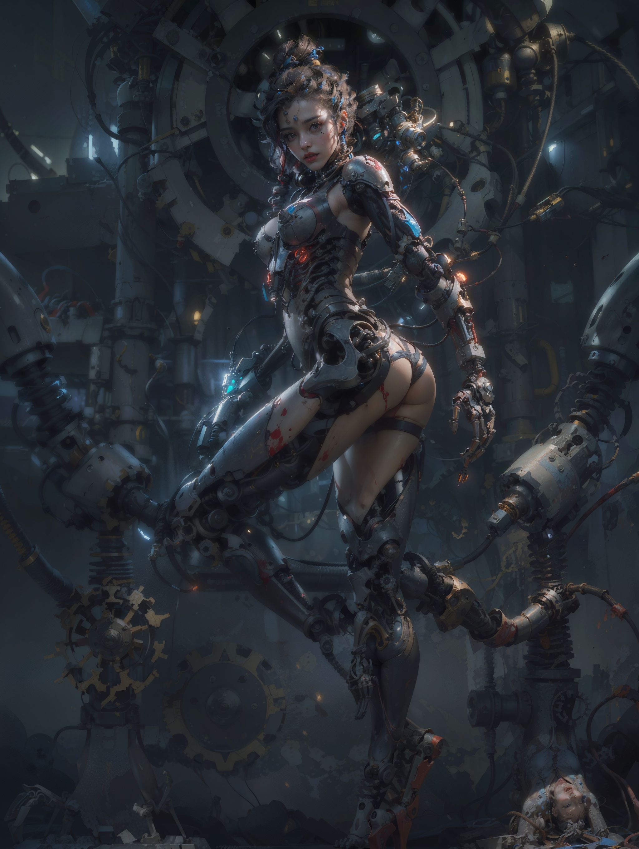 official art, unity 8k wallpaper, ultra detailed, beautiful and aesthetic, masterpiece, best quality, realistic, (zentangle, mandala, tangle, entangle), fractual art, extremely detailed, (dynamic angle),dramatic lighting, ((mechanical girl)), biomechanical, solo,full body,(machine made joints:1.2),((machanical limbs)),(blood vessels connected to tubes),(mechanical vertebra attaching to back),(mechanical cervial attaching to neck), (wires and cables attaching to neck:1.2),(wires and cables on head:1.2)(character focus),science fiction,extreme detailed,colorful,highest detailed<lora:oc_v10:0.25:BODY> <lora:mshnrobot:0.6> mshn robot <lora:zhongfenghua:0.4> zhongfenghua