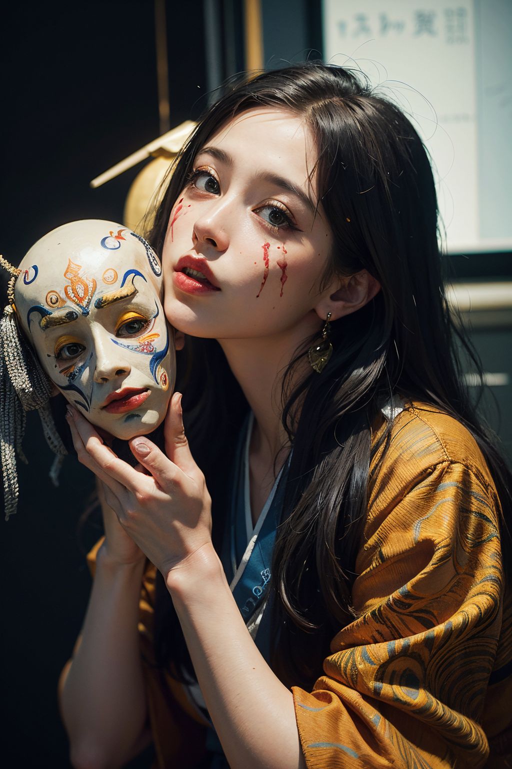 official art, unity 8k wallpaper, ultra detailed, beautiful and aesthetic, masterpiece, best quality, (zentangle, tangle, entangle), 1girl, extremely detailed, dynamic angle, cowboyshot, the most beautiful form of chaos, elegant, a brutalist designed, vivid colours, romanticism, by james jean, roby dwi antono, ross tran, francis bacon, michal mraz, adrian ghenie, petra cortright, gerhard richter, takato yamamoto, ashley wood, atmospheric, ecstasy of kabuki masks, (illustration beautiful by apterus:1.2), creepy japanese kabuki performing on a theatre stage, traditional face paint, traditional japanese village, detailed background, creepy scenery,