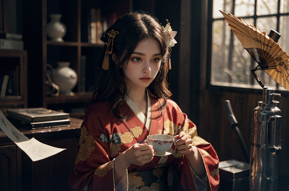 Whimsical abstraction, emotive colors, surreal juxtaposition, bold contrasts, immersive depth,solo, Creativity, Kimono mage, silk robes, paper fan, origami spell, tea ceremony, elegance, <lora:LowRAv2:0.4> <lora:adventurers_v1:0.5>