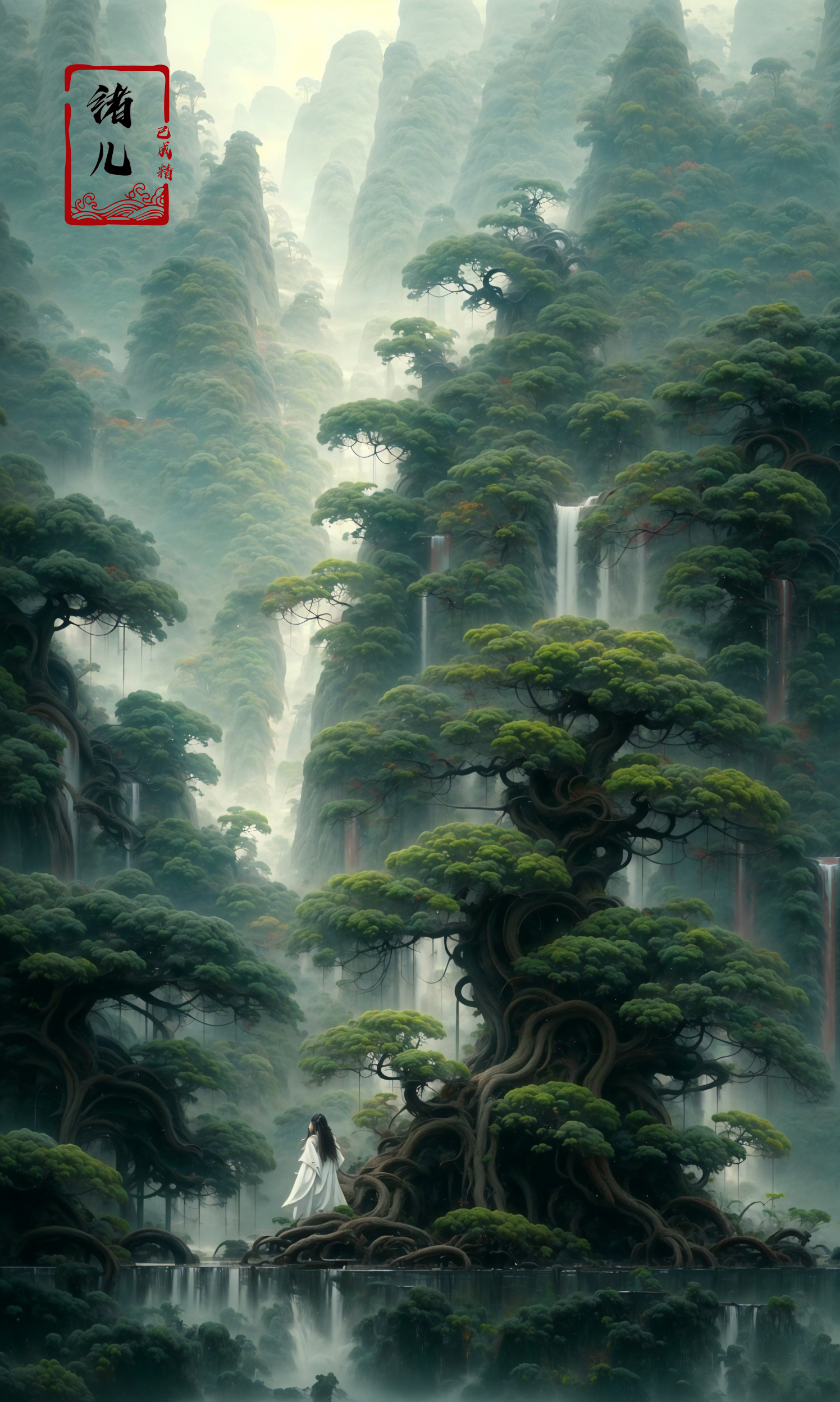 an painting in a style of oriental painting, in the style of matte painting, layered and atmospheric landscapes, rich and immersive, quiet contemplation, dark white and green, history painting, zen-inspired, grandeur of scale highly detailed, dynamic, cinematic, stunning, realistic lighting and shading, vivid, vibrant, 8k,octane render, unreal engine, very detailed, concept art, realistic, Cry engine, wide shot 1 girlvery long hairwhite hair(upper body:1.0) <lora:~Q?-g~ pine:0.9>