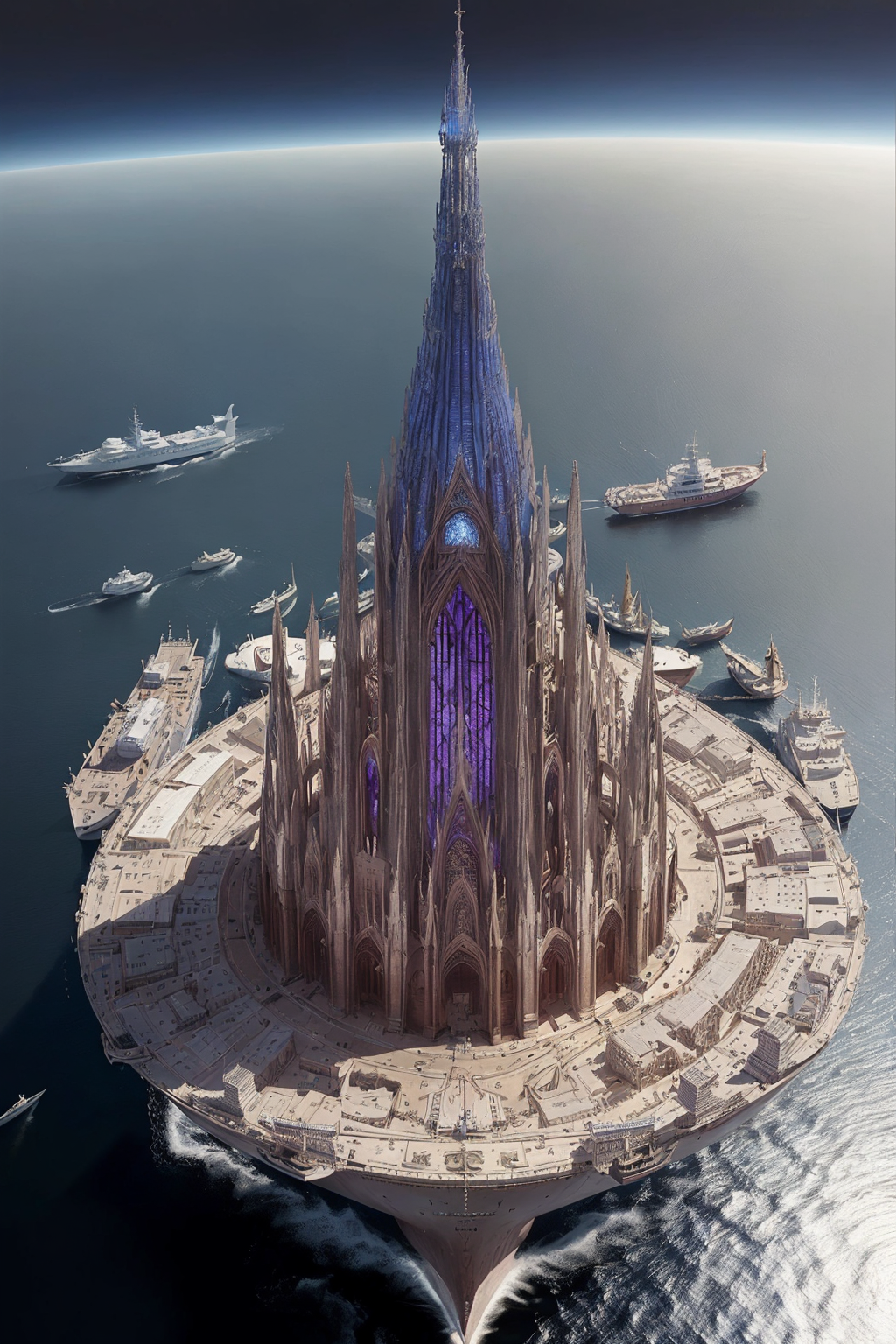 aerial view, stacked architecture city on giant towers and rings with many arches and sci-fi metallic cathedrals with flying buttresses, many boats and ships, a matte painting by james gurney, trending on cgsociety, oversaturated, ultra sharp, hyper realistic